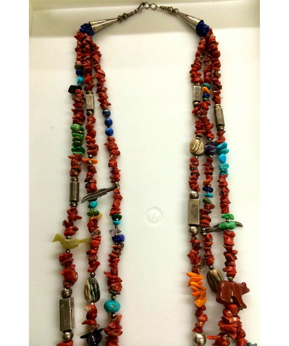 This unique treasure necklace consist of three strands with coral, turquoise and spiny oyster beads along with several sterling silver accent pieces. Very unique. Look closely at the pics, it is a work of art!
