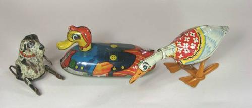 Three tin toys including Marx (Flipo) dog, Unique Art goose and unmarked duck. Fair to Good Cond.