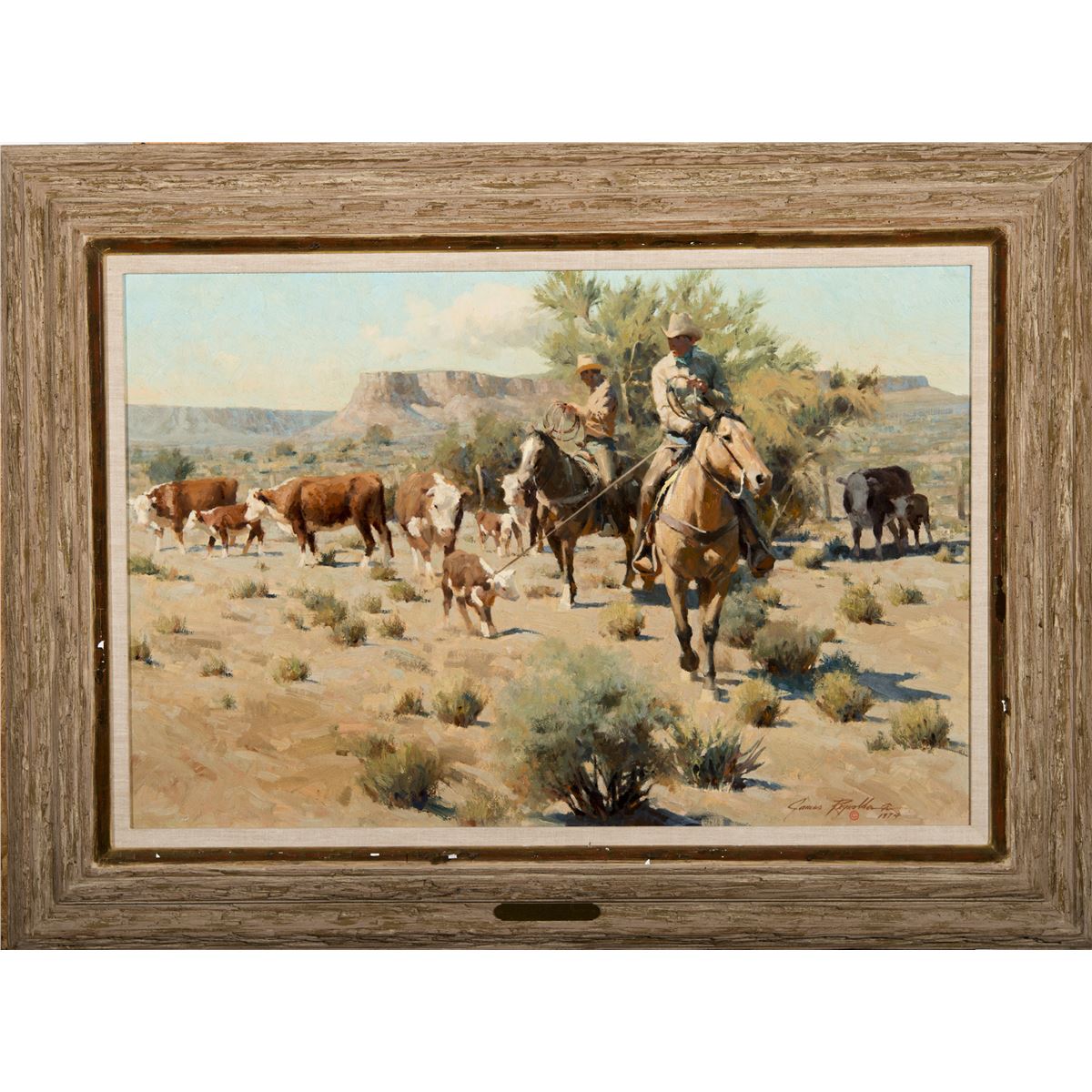 Three to Go seems like a tongue-in-cheek title. If the cowboys are roping calves and think they only have three to go before day’s end, they need to look behind them in the shadows at right, where a cow and a fourth calf hide out. The canvas is classic Reynolds. High key light on soft forms lets color do the work of line, harmonizing the composition. But there are still four to go.
