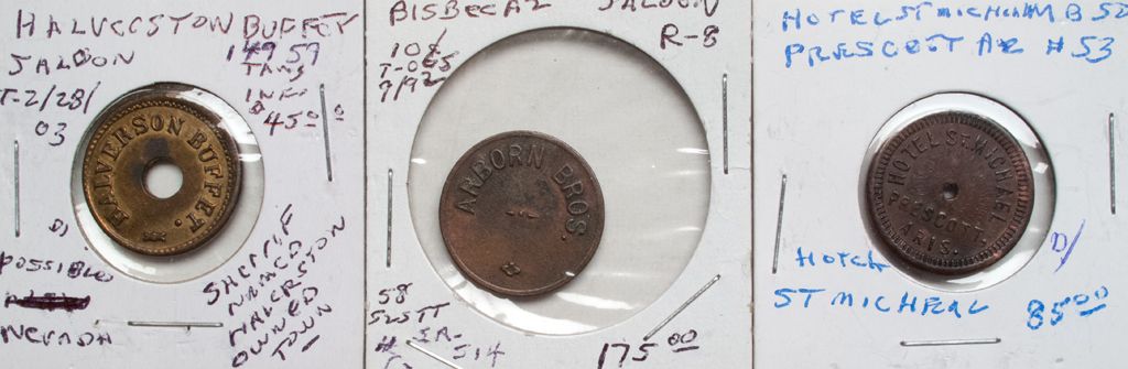 1) Hotel St. Michael, Prescott, Aris // GF 5c IT. This is a great token as Arizona is misspelled!. 2) Arborn Bros // GF 10c IT. Brisbee token. Barber. c907-1911. 3) Halverston Buffet. GF 5c IT. Circular hole in center. Currently attributed to Fond du Lac.City: County: State: AZ and WIDate: