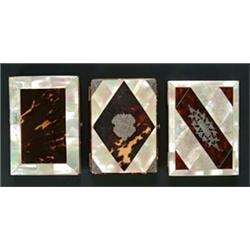 Three tortoiseshell and mother of pearl rectangular purses, one decorated with diamond shaped pan...