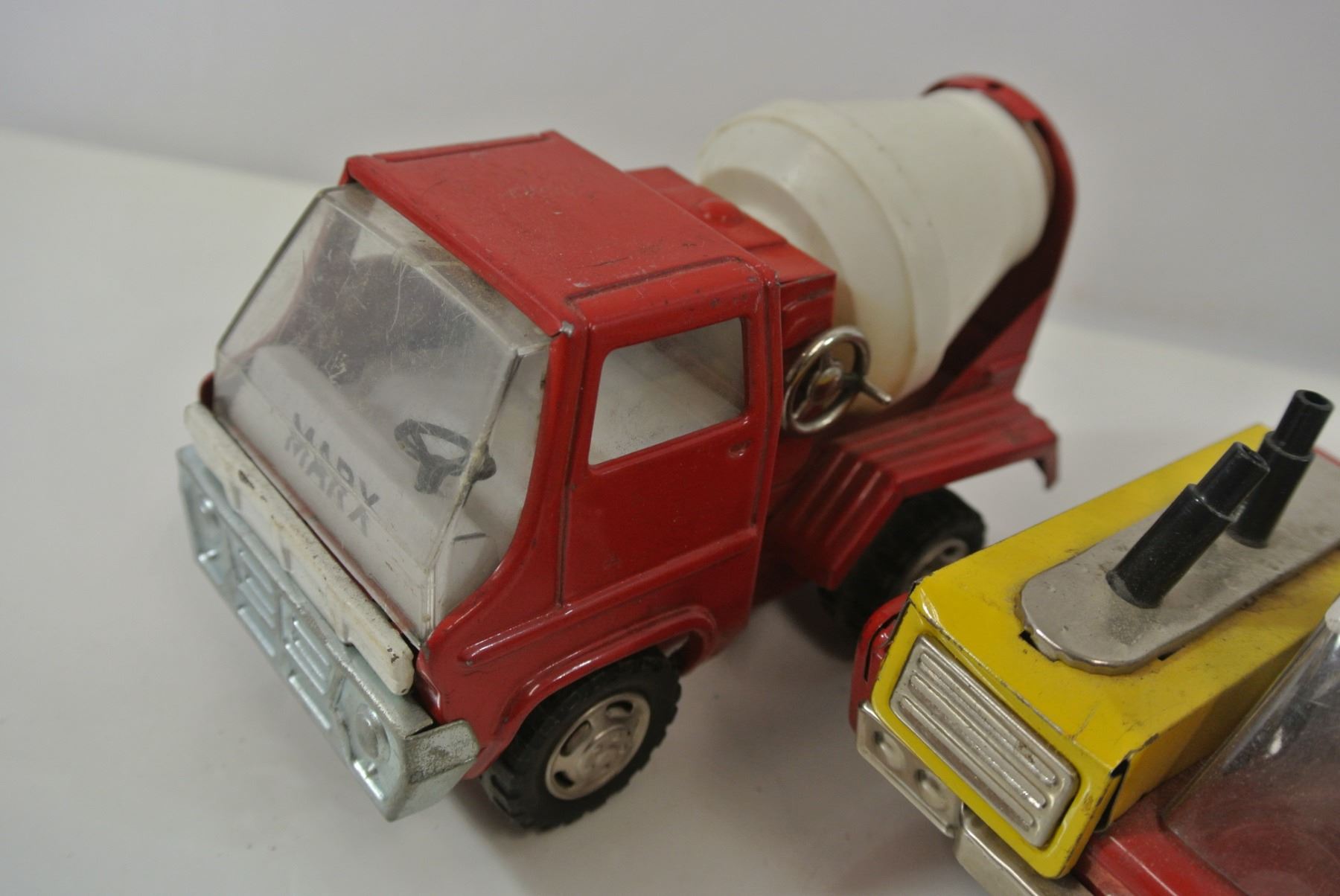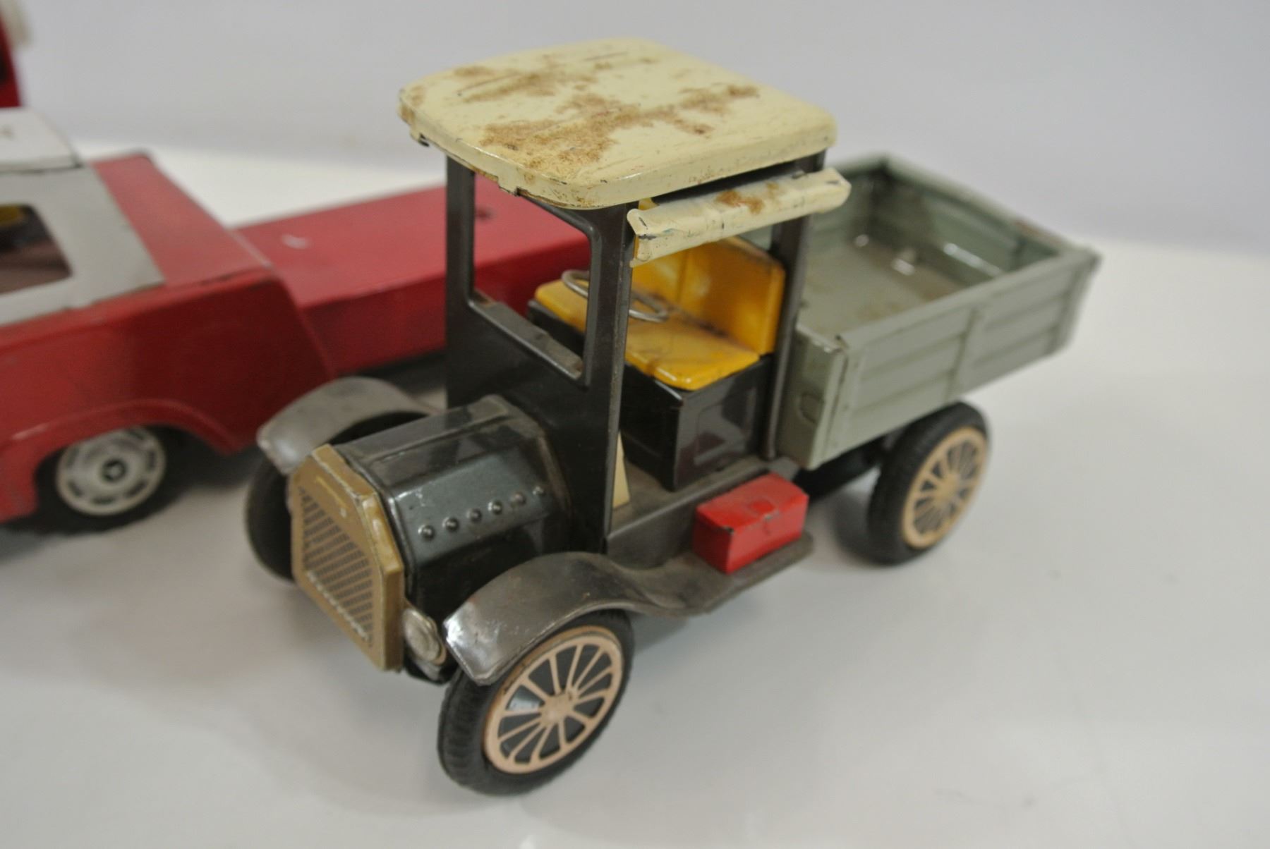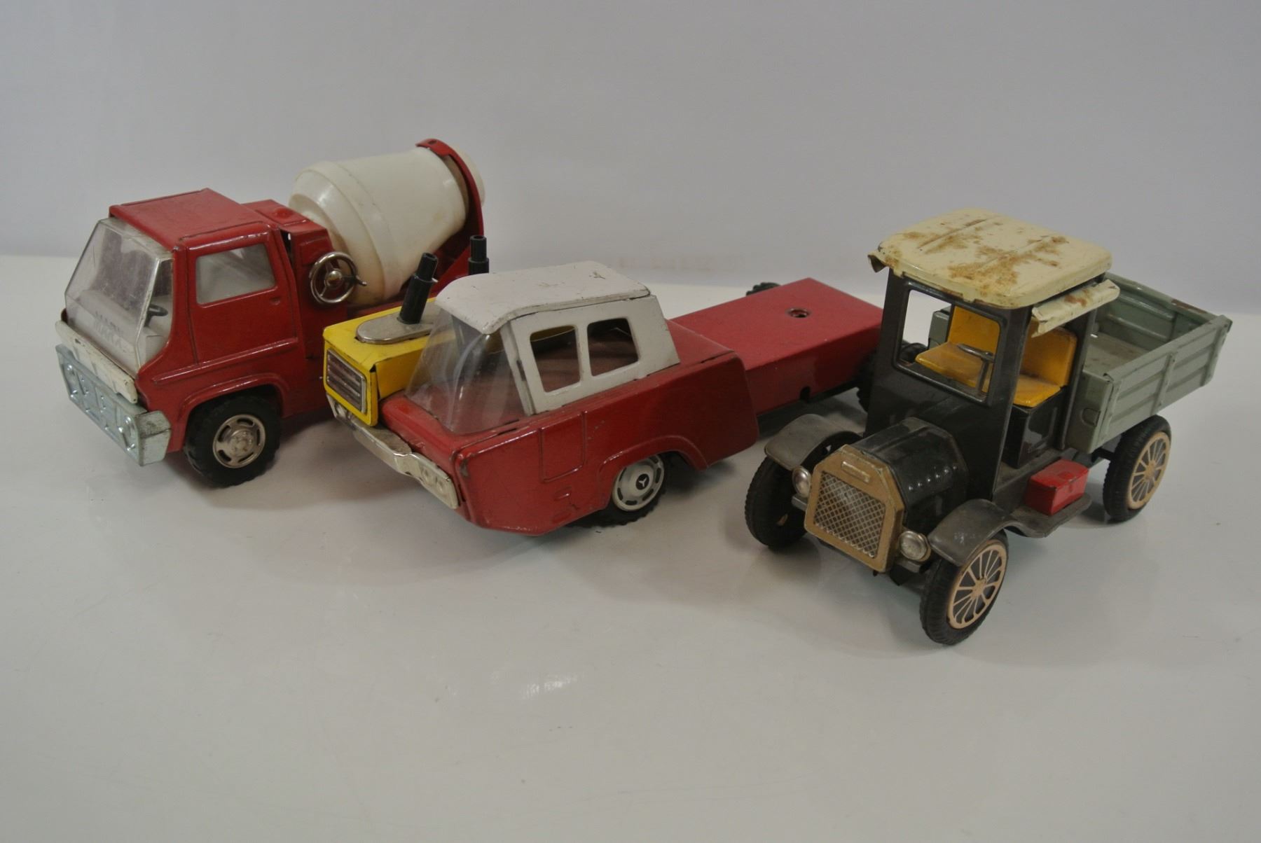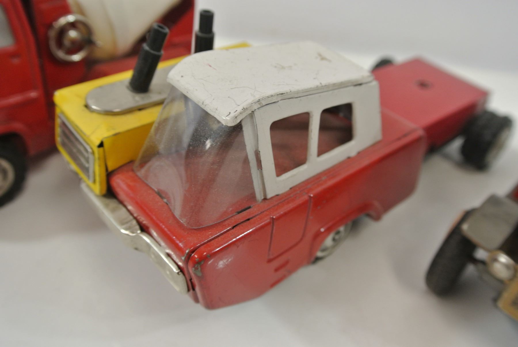 Marx cement truck, unbranded Japanese tractor, Japanese friction car