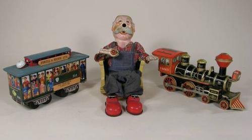 Three toys including battery operated train engine, trolley car and smoking man in rocker.