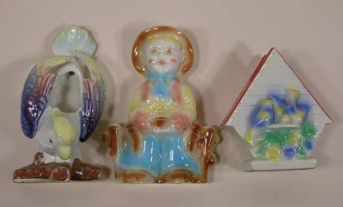 Three unmarked wall pockets including one cowboy, one birdhouse and one parrot. Good Cond.
