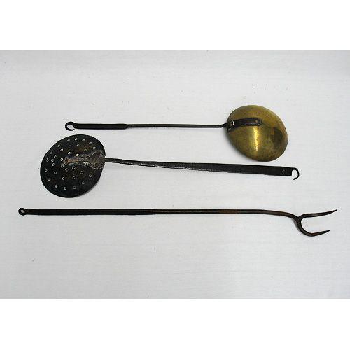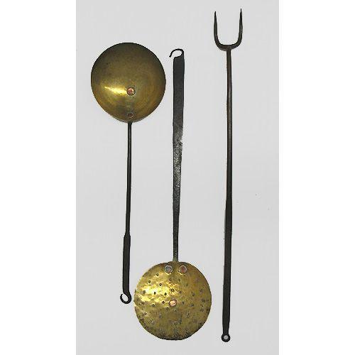 Three utensils including brass skimmer with iron handle and copper rivets; 22 1/2 inches (purchased from William Beck Richmond VA in 1982); brass dipper with iron handle and copper rivets; 25 inches (purchased from Willowdale Antiques Kennett Square PA in 1982); and an iron fork; 26 1/4 inches; all 19th C. (no visible defects)