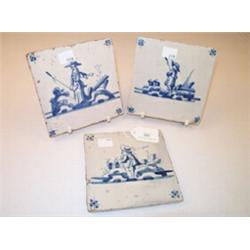 Three various English 18th Century Delft tiles decorated with anglers in landscape, 13cms square...