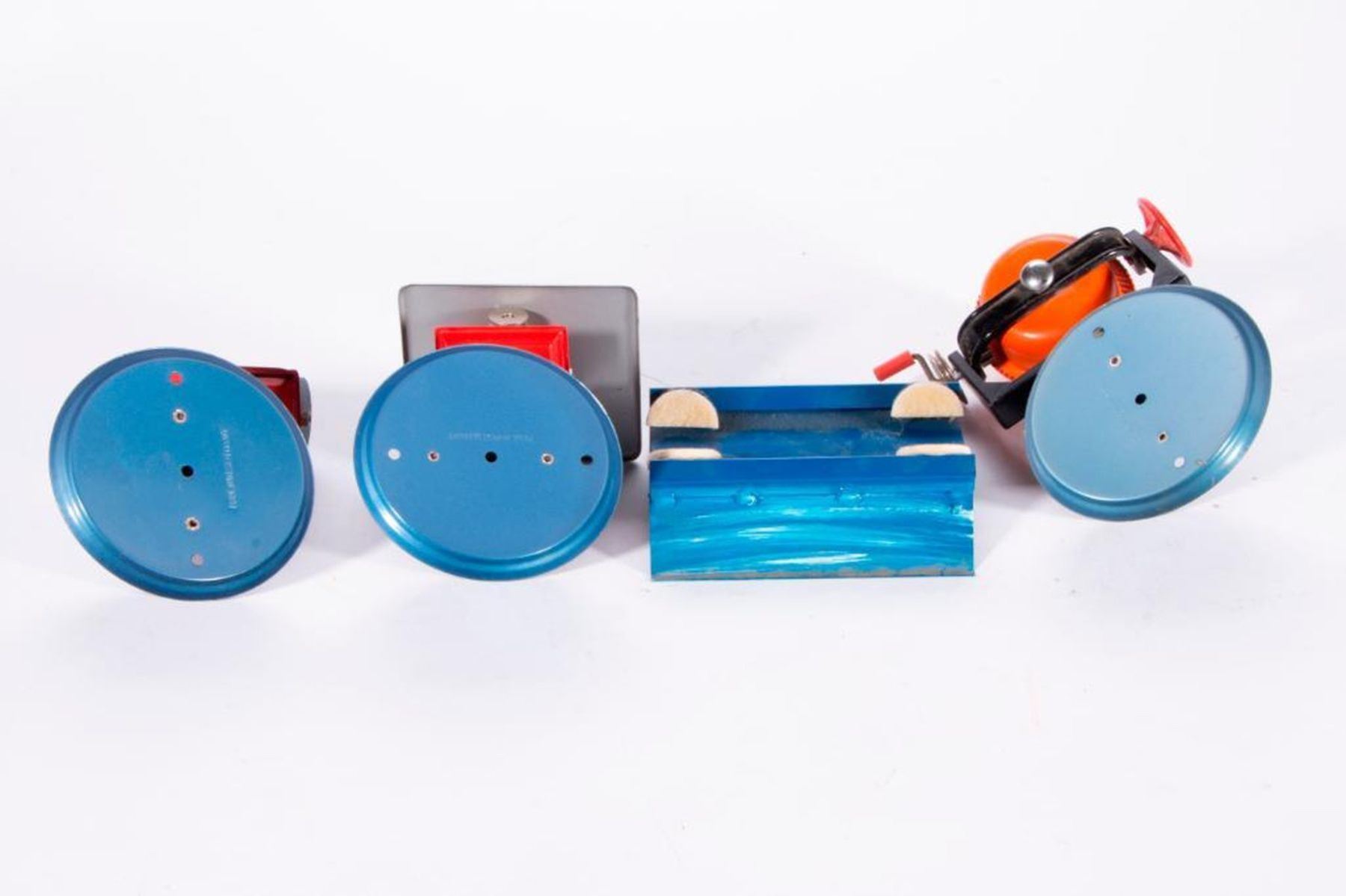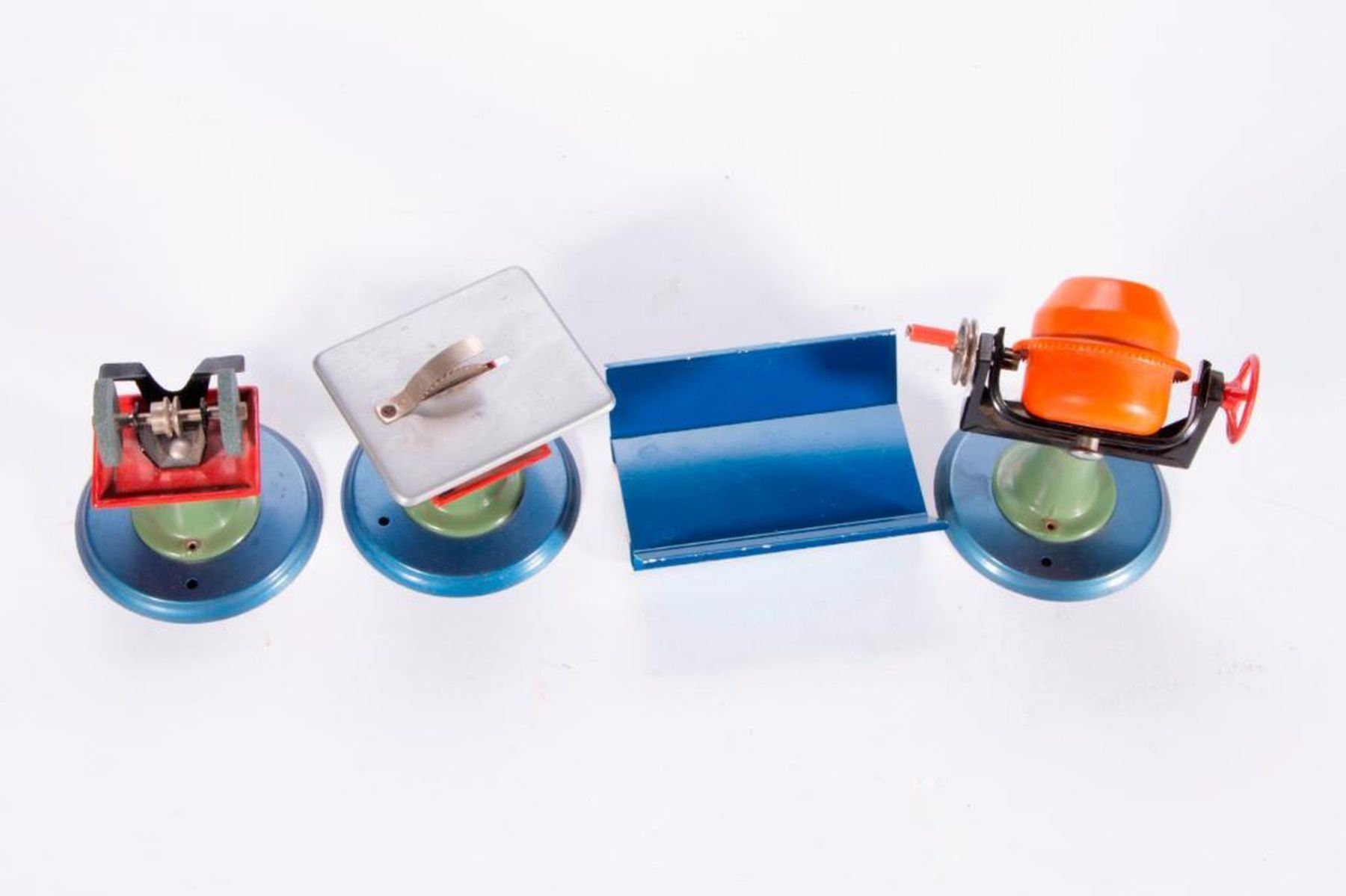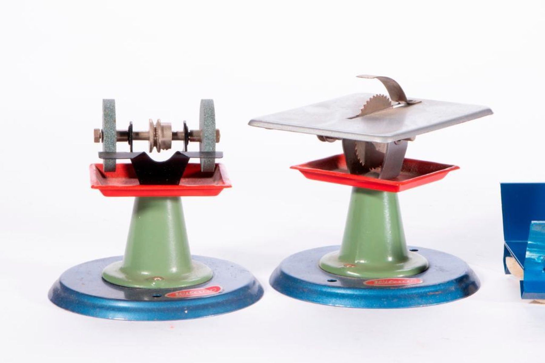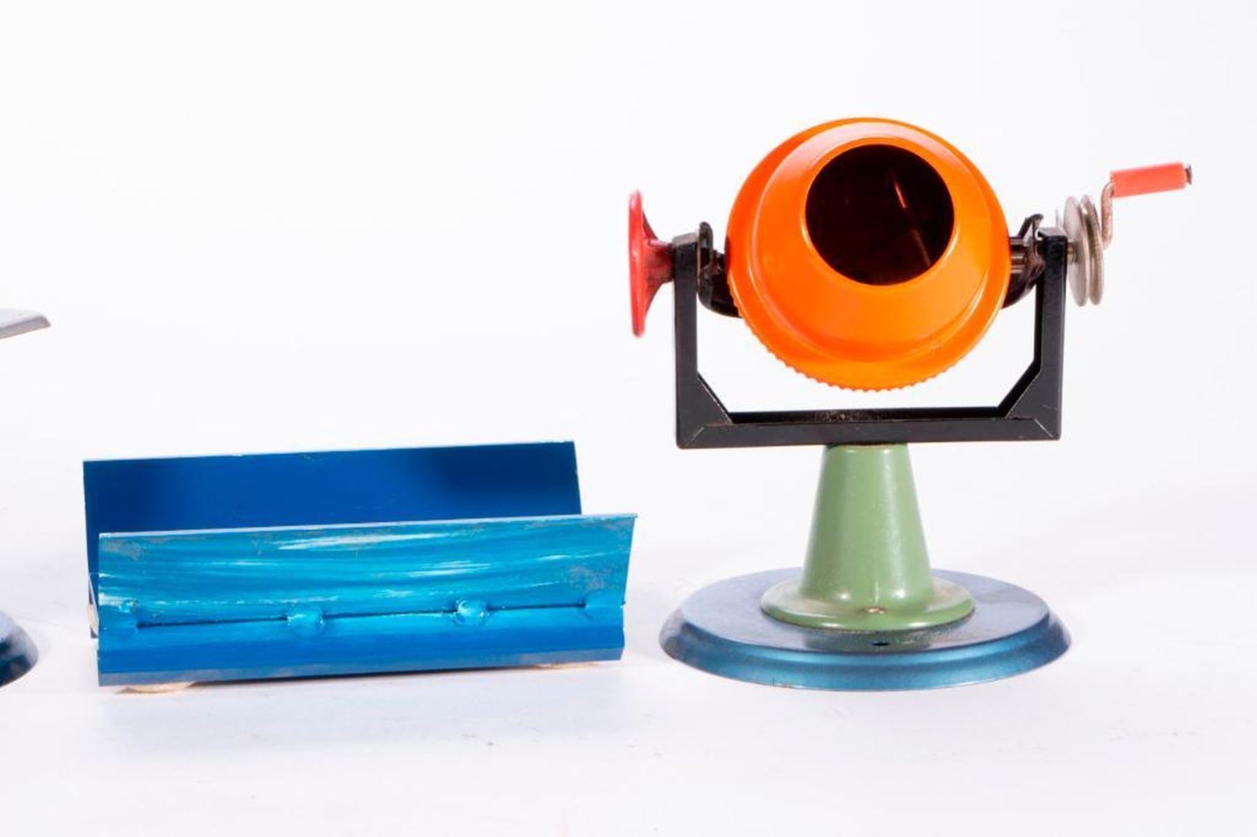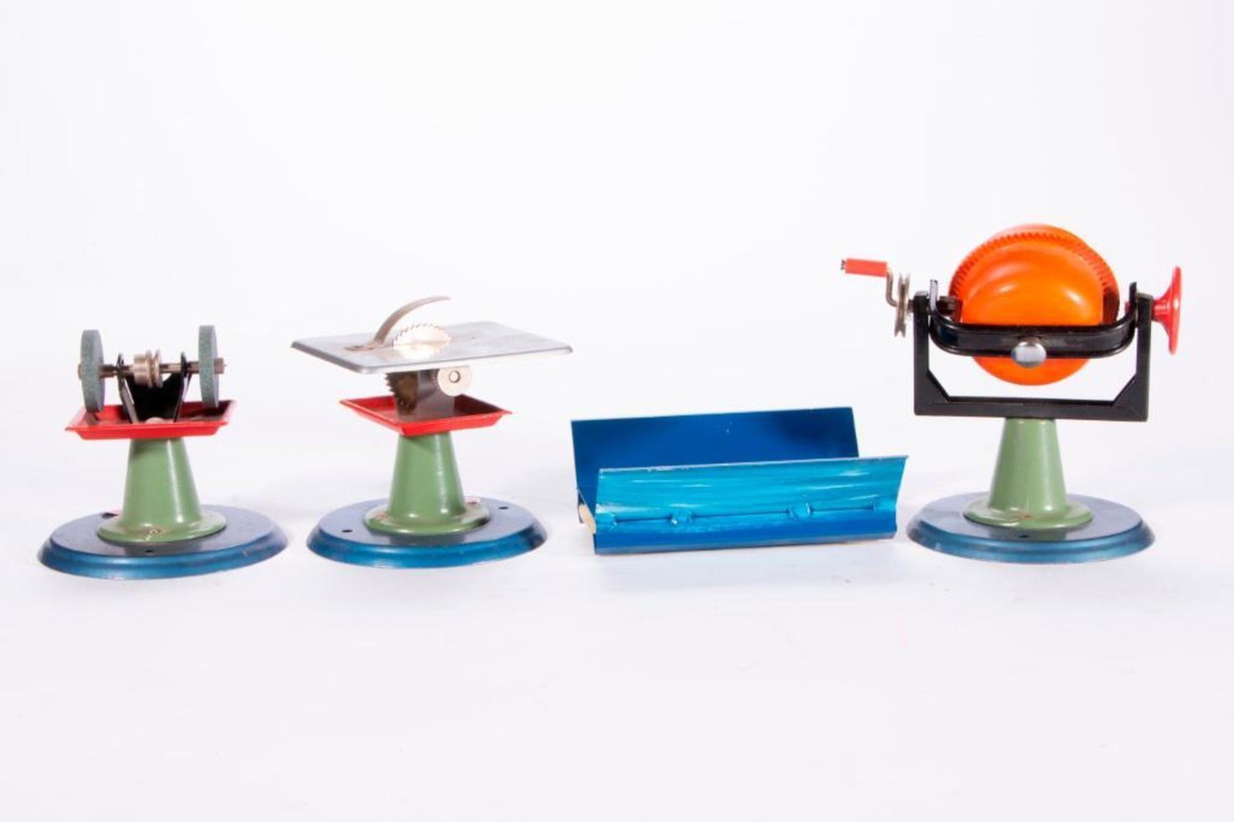 Three vintage German Wilesco toy tools stamped made in West Germany (plus an unmarked toy bin). Largest measuring 5 inches high x 4 x 3 1/2. Items are sold as is. Please inquire about condition if not otherwise stated.
