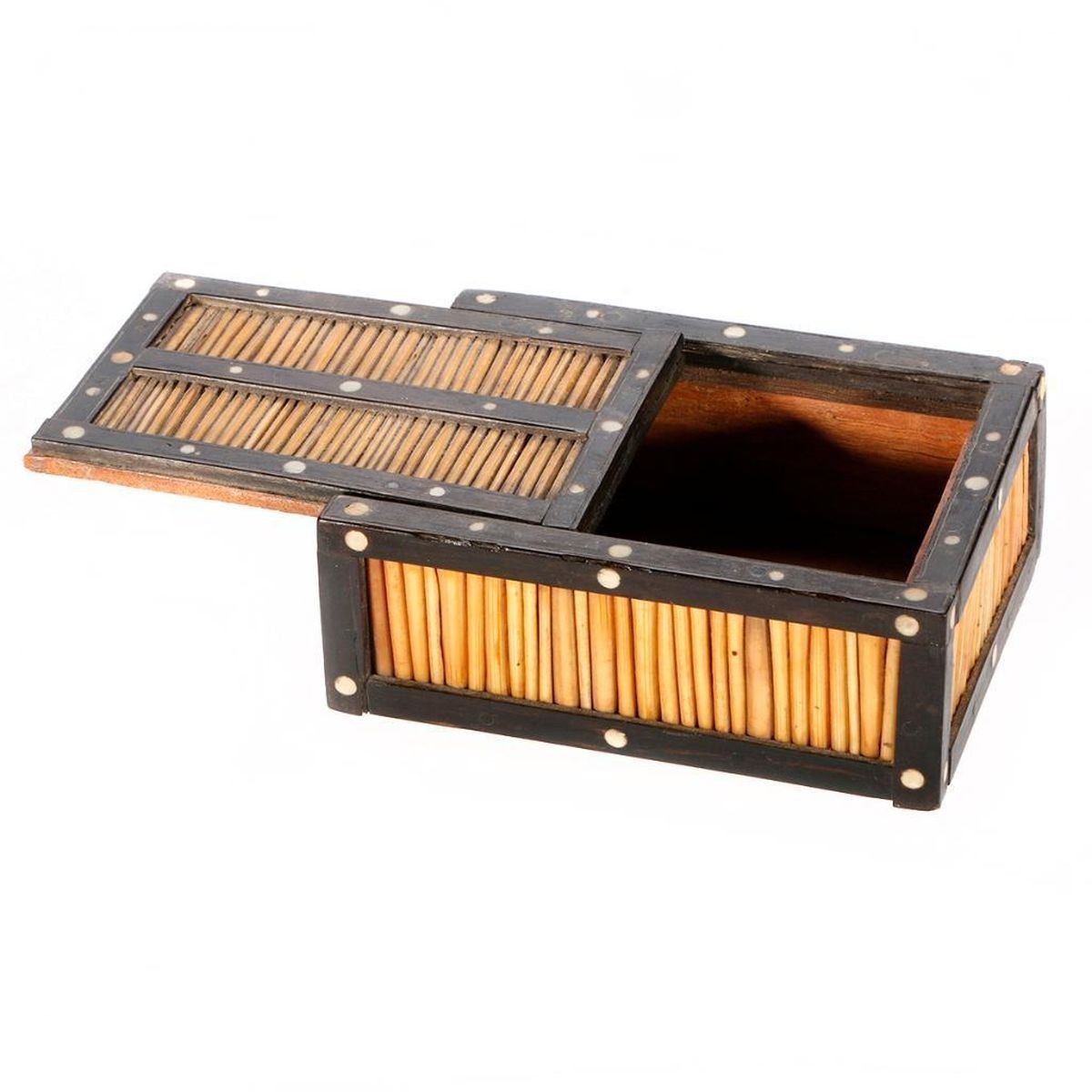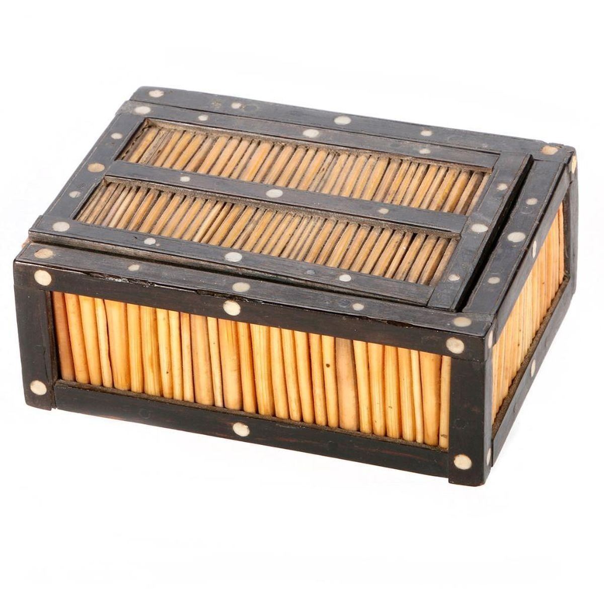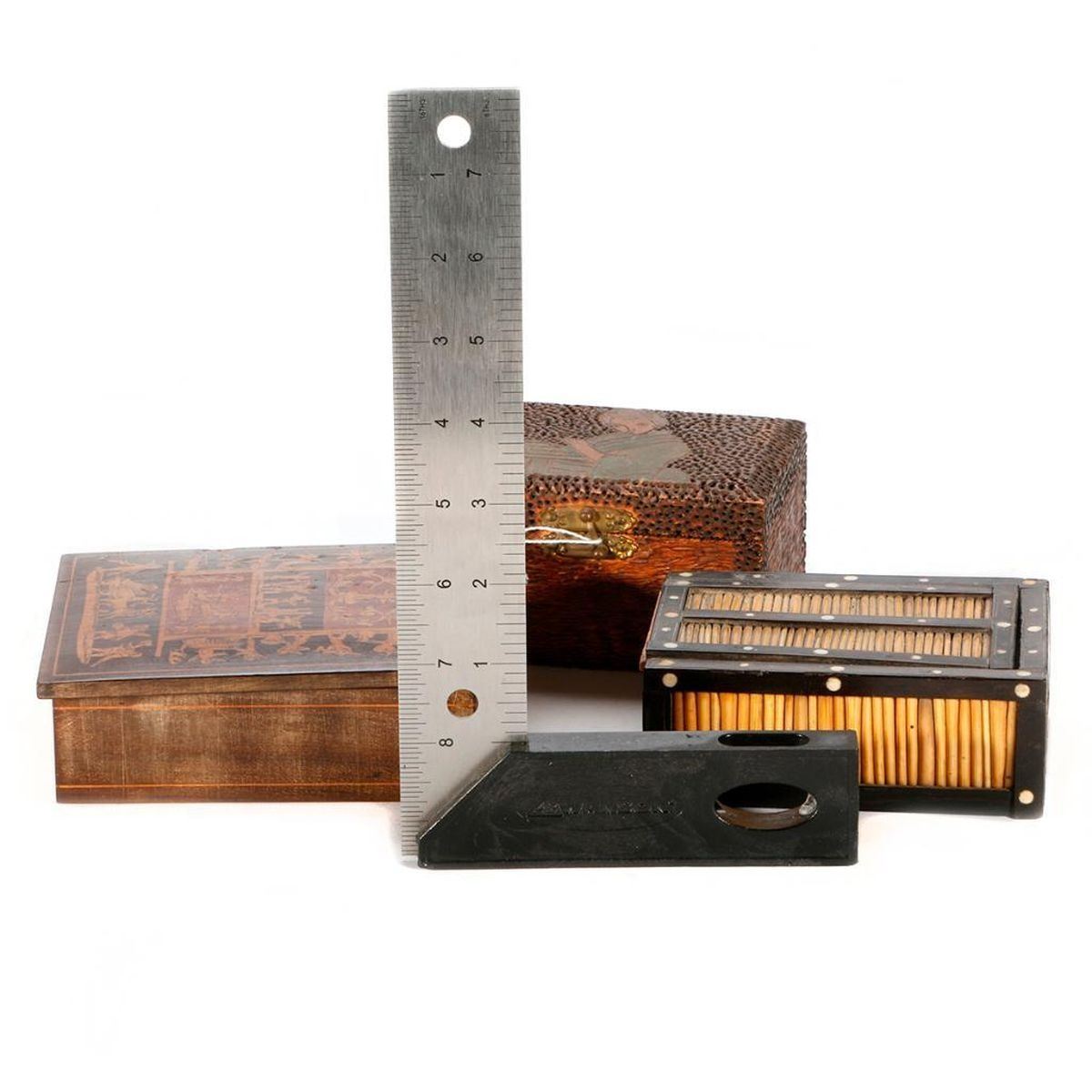 Three early 20th century boxes: an Italian inlaid box, a Japanese folk art box, and an Indian quill box. The largest box measures 2 1/2 inches high x 5 x 3 3/4.