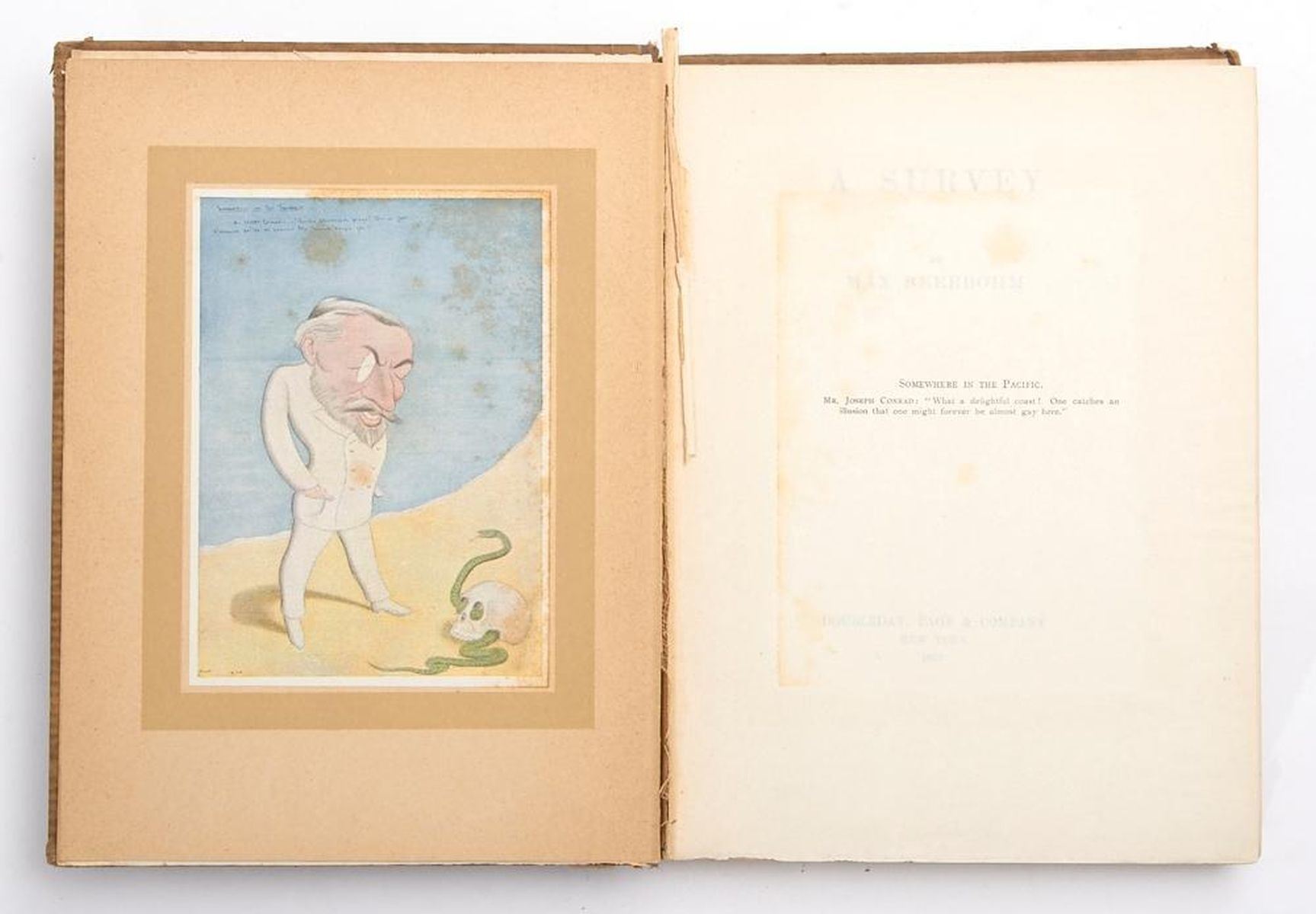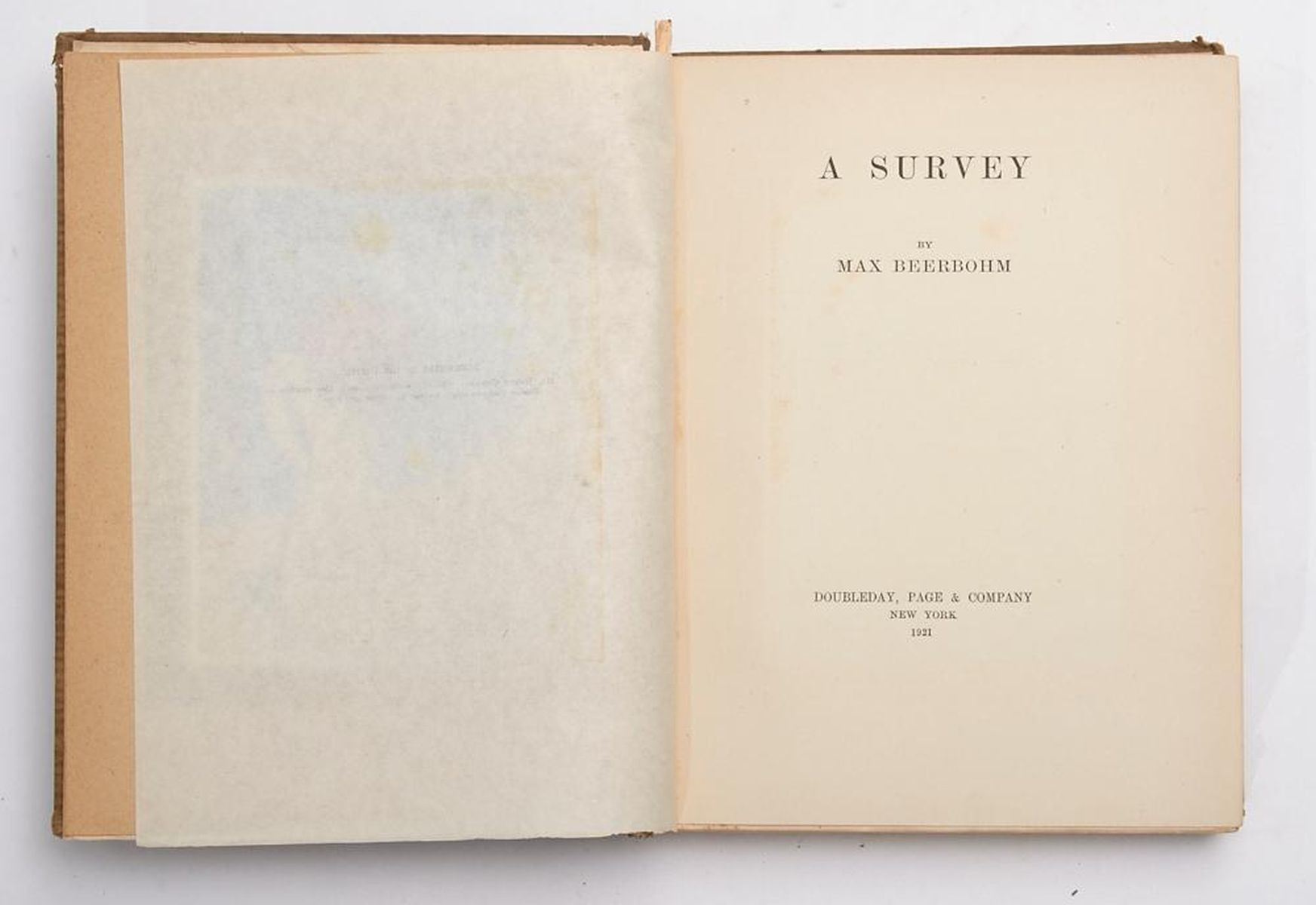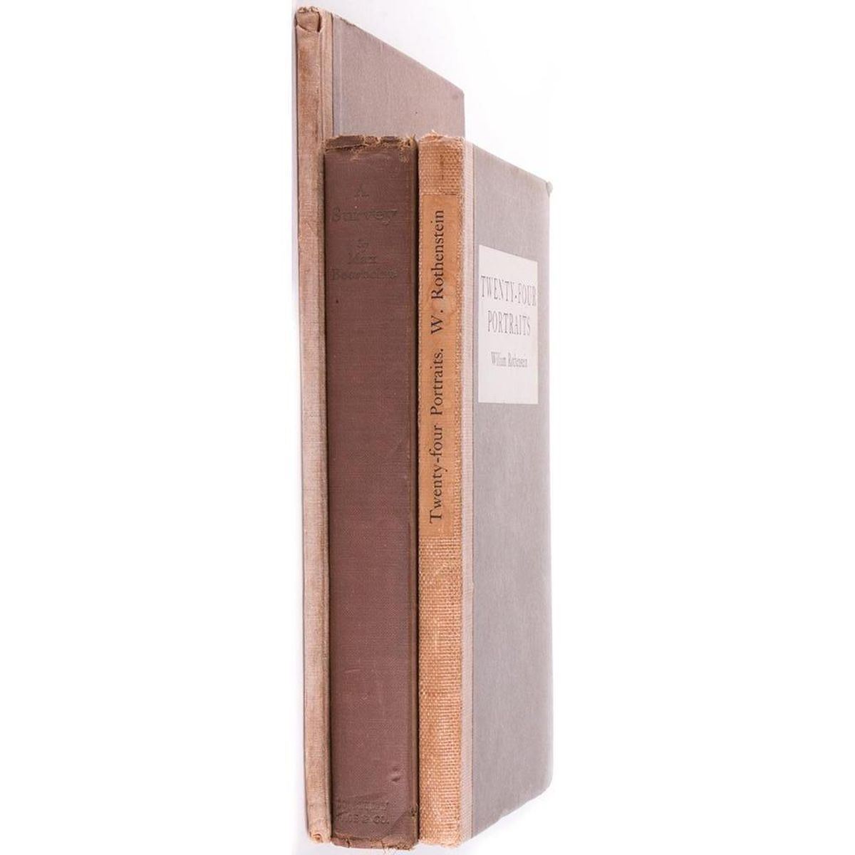 Title: The Beginning of the World Twenty-Five Pictures Author: Edward Burne-Jones Place: London Publisher: Longmans Green & Co. Date: 1902. Description: First Edition. Hardcover. Original linen spine over titled paper covered boards. Boards scratched. Spine stained and rubbed with wear and some loss on top and bottom. Pages are uncut, clean and crisp with occasional yellowing at bottoms. Images are quite stunning. Condition: Overall, good condition. William Rothenstein, Twenty-Four Portraits With Critical Appreciation by Various Hands 1920. George Allen & Unwin LTD., London. Hardcover. Limited Edition. Corners are bumped and worn, spine minor fraying at top, boards some denting top and bottom. Some water marks to spine. Overall good condition. Max Beerbohm, A Survey 1921, Doubleday, Page & Company, NY. Hardcover. Brown cardboard boards with wear, tear and bumping to all corner edges and spine. Cover board is separating from the pages. Overall, fine condition.