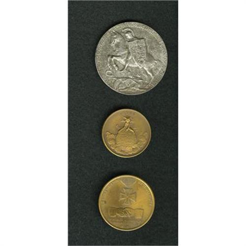 <B>Threesome of German Medals.</B></I> <B>1914 Furor Teutonicus,</B></I> Zartzmann 2042, not listed in bronze, 16.7 gm, 33.5 mm.; <B>1915 iron </B></I>medal issued to commemorate the alliance of Austria, Germany, Turkey, and Bulgaria, 41.8 gm, 50 mm; and <B>1915 U.S. Friendship</B></I> medal in bronze, issued by Whitehead and Hoag, Newark, N.J.<BR><BR><b>Shipping:</b> Coins & Currency (<a target="_blank" href="http://www.heritageauctions.com/common/shipping.php">view shipping information</a>)