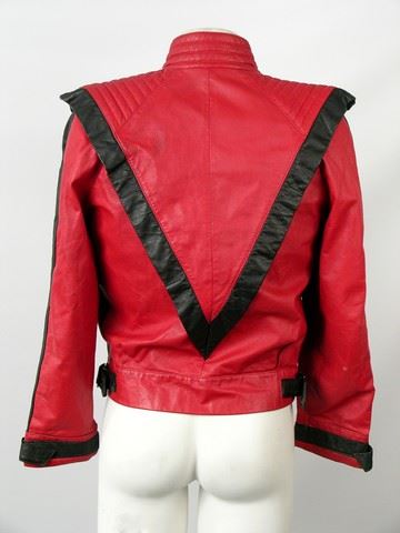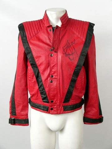 An exact replica of the iconic red "Thriller" leather jacket that Michael Jackson wore in the famous "Thriller" music video. It is signed by Michael Jackson himself with "Love Michael Jackson" on the left front. This beautiful jacket was signed in 2006 before the UK World Music Awards night at the Hempel Hotel in London. Jacket has the "Metal" label, size 38.