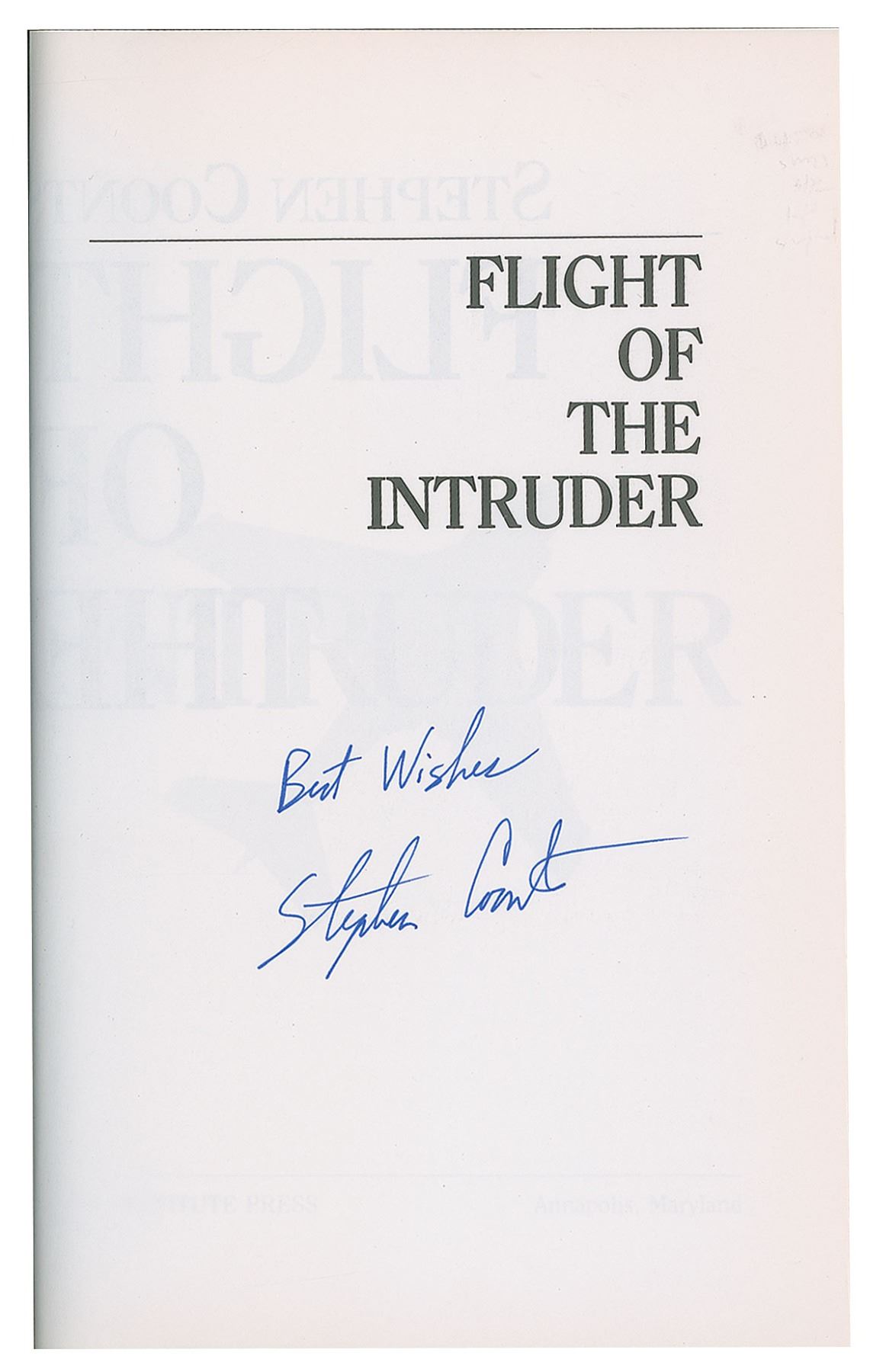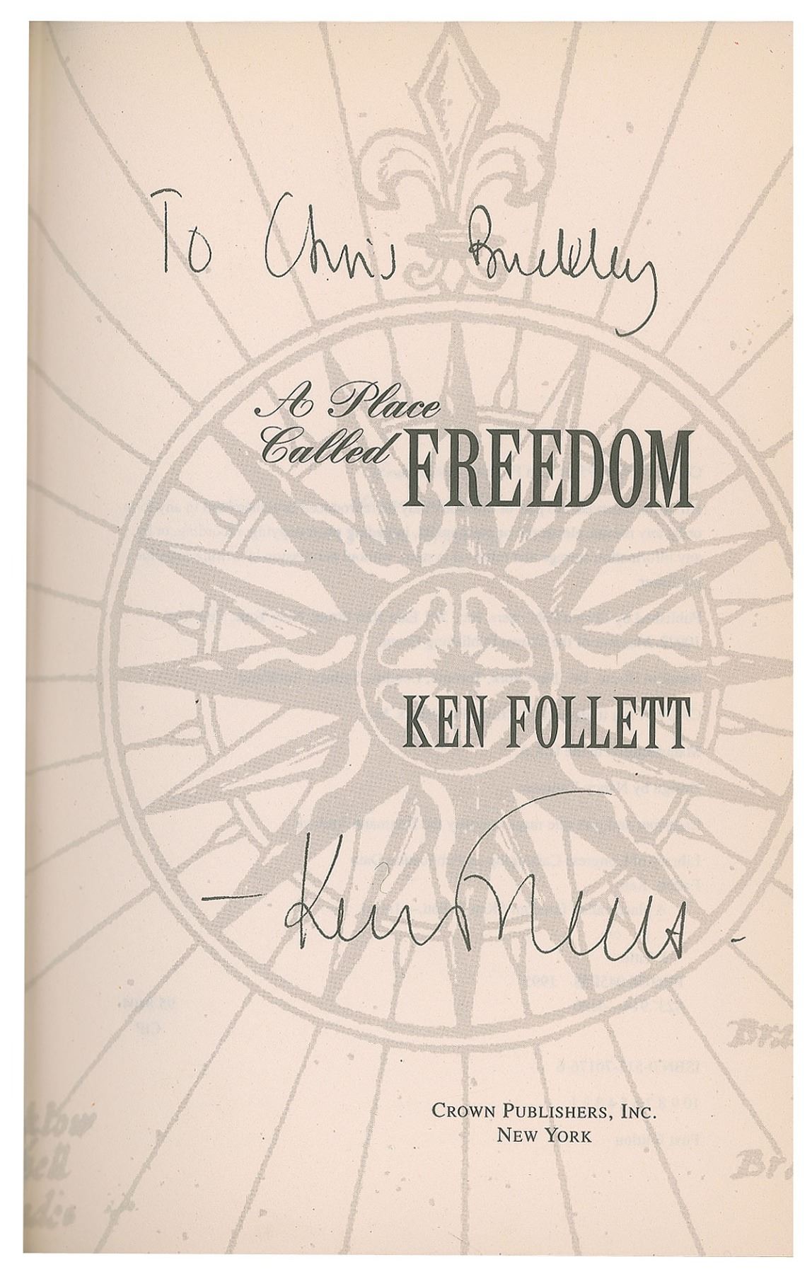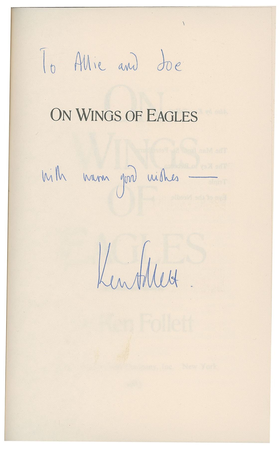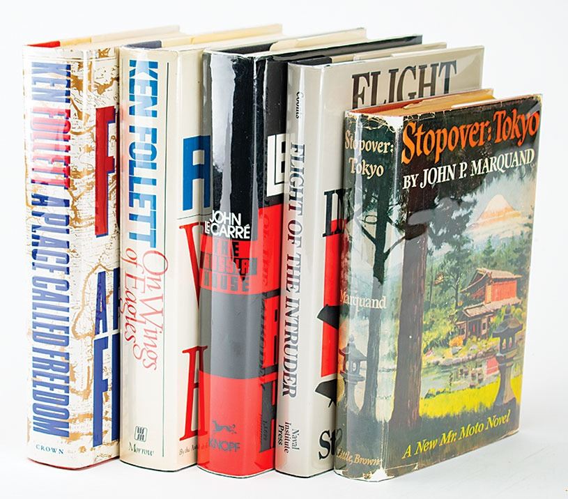 Five signed first editions of thrillers, all hardcovers with dust jackets, including: Stopover: Tokyo, signed and inscribed on the first free end page in fountain pen by John P. Marquand; The Russia House, signed on a free end page in black felt tip by John Le Carre; Flight of the Intruder, signed on the half-title page in blue felt tip by Stephen Coonts; On Wings of Eagles, signed and inscribed on the half-title page in blue ballpoint by Ken Follett; and A Place Called Freedom, signed and inscribed on the title page in black felt tip by Ken Follett. In overall very good to fine condition, with wear to the jacket for Stopover: Tokyo, and a price-clipped jacket for A Place Called Freedom.