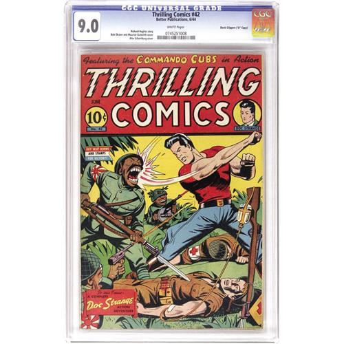 <B>Thrilling Comics #42 Davis Crippen ("D" Copy) pedigree (Better Publications, 1944) CGC VF/NM 9.0 White pages.</B></I> It's a shame this Japanese war cover by Alex Schomburg doesn't turn up more often, but that's all the more reason to snap up this copy! No copy has been graded higher by CGC to date. Overstreet 2006 VF/NM 9.0 value = $338; NM- 9.2 value = $450. CGC census 6/06: 2 in 9.0, none higher. <I>From the Crippen Collection.</B></I> <BR><BR><B>Important notice:</B> Heritage usually auctions material at the rate of 200-250 lots per hour. On some occasions eBay Live bid software or the Internet may not be able to keep up with the pace of the auction. We recommend placing a realistic absentee bid now as insurance to avoid disappointment. Occasionally the auctioneer may eliminate or reject an eBay Live bid, and the auctioneer may also reopen a lot after the close of the eBay live bidding (usually because we missed an audience bid), and may reject your bid even if it shows you as the winning bidder. By bidding via eBay Live, you agree that Heritage may award the lot to another bidder at its sole discretion under the circumstances described above or any other reasonable circumstances. Since eBay bids are not shown to us until we open the lot on the floor, we treat those bids just like floor bids. In most cases the floor responds before the eBay bid is presented to us, due to Internet lag time, so for consistency we have made it a policy that floor bids are always considered first over tie eBay live bids. Also please note that all Heritage lots purchased through eBay Live carry a 22.5% Buyer's Premium. Please make sure you read the Terms and Conditions before you bid. This lot is being auctioned in conjunction with a live floor auction by Heritage Auction Galleries. All final auction and invoice information will be supplied by Heritage Auction Galleries, and all other information should be considered preliminary. Lot:41001 <BR><BR><B>Winning Notification and Billing:</B> After the FINAL session in this auction is complete, Heritage will send e-mail and snail mail invoices. This process normally takes several days. All final auction and invoice information will be supplied by Heritage Auction Galleries, and all other information should be considered preliminary. <BR><BR>This auction will be conducted on a live auction floor and over the Internet through eBay Live. If you choose to place an absentee bid, please take a moment to <font color='#0000ff'><u><a href='http://pages.ebay.com/liveauctions/help/before/laabsentee.html'>learn how eBay Live absentee bidding works</a></u></font><font color='#000000'>