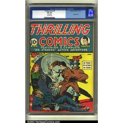 Thrilling Comics #5 (Better Publications, 1940) CGC VF+ 8.0 Off-white pages. This is not an easy issue to find in any condition, but in high grade it is almost non-existent. The colors on this copy are rich and vibrant, with gloss intact. It appears NM from the front, only a few tiny dings on the side of the spine and a tiny dust shadow strip on the back cover edge keep it from grading higher. CGC notes: " 2 Siamese pages." This is a very solid copy of a scarce book. Overstreet 2002 FN 6.0 value = $182; NM 9.4 value = $575. Important notice: We expect to be auctioning lots at the rate of 200-250 per hour. Sometimes eBay Premier live bid software cannot keep up with that pace, so we strongly recommend that you place a realistic proxy bid now as insurance to avoid disappointment. Also please note that all Heritage/CAA lots purchased through eBay Premier carry a 20% Buyer's Premium.
