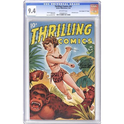 <B>Thrilling Comics #65 Davis Crippen ("D" Copy) pedigree (Better Publications, 1948) CGC NM 9.4 Off-white pages.</B></I> This airbrushed Alex Schomburg cover features Princess Pantha. This near-perfect copy is a prime example of what got collectors excited about the "D" copies in the first place! Overstreet 2006 NM- 9.2 value = $475. CGC census 7/06: 1 in 9.4, 1 higher. <I>From the Crippen Collection.</B></I> <BR><BR><B>Important notice:</B> Heritage usually auctions material at the rate of 200-250 lots per hour. On some occasions eBay Live bid software or the Internet may not be able to keep up with the pace of the auction. We recommend placing a realistic absentee bid now as insurance to avoid disappointment. Occasionally the auctioneer may eliminate or reject an eBay Live bid, and the auctioneer may also reopen a lot after the close of the eBay live bidding (usually because we missed an audience bid), and may reject your bid even if it shows you as the winning bidder. By bidding via eBay Live, you agree that Heritage may award the lot to another bidder at its sole discretion under the circumstances described above or any other reasonable circumstances. Since eBay bids are not shown to us until we open the lot on the floor, we treat those bids just like floor bids. In most cases the floor responds before the eBay bid is presented to us, due to Internet lag time, so for consistency we have made it a policy that floor bids are always considered first over tie eBay live bids. Also please note that all Heritage lots purchased through eBay Live carry a 22.5% Buyer's Premium. Please make sure you read the Terms and Conditions before you bid. This lot is being auctioned in conjunction with a live floor auction by Heritage Auction Galleries. All final auction and invoice information will be supplied by Heritage Auction Galleries, and all other information should be considered preliminary. Lot:41001 <BR><BR><B>Winning Notification and Billing:</B> After the FINAL session in this auction is complete, Heritage will send e-mail and snail mail invoices. This process normally takes several days. All final auction and invoice information will be supplied by Heritage Auction Galleries, and all other information should be considered preliminary. <BR><BR>This auction will be conducted on a live auction floor and over the Internet through eBay Live. If you choose to place an absentee bid, please take a moment to <font color='#0000ff'><u><a href='http://pages.ebay.com/liveauctions/help/before/laabsentee.html'>learn how eBay Live absentee bidding works</a></u></font><font color='#000000'>