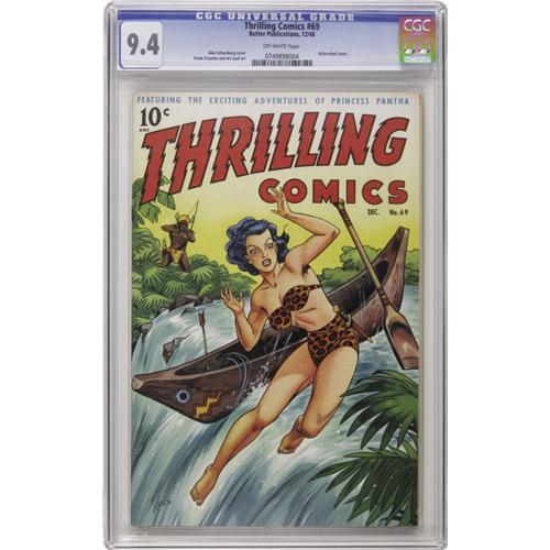 <B>Thrilling Comics #69 (Better Publications, 1948) CGC NM 9.4 Off-white pages.</B></I> Two Frank Frazetta stories are contained in this issue, and we don't think any other Better/Standard/Nedor issue can make that claim. And of course, the Alex Schomburg cover is fantastic, so we expect intense interest in this sole highest-graded copy. Overstreet 2006 NM- 9.2 value = $650. CGC census 9/06: 1 in 9.4, none higher.<BR><BR><b>Shipping:</b> Slabbed Comic (<a target="_blank" href="http://www.heritageauctions.com/common/shipping.php">view shipping information</a>)