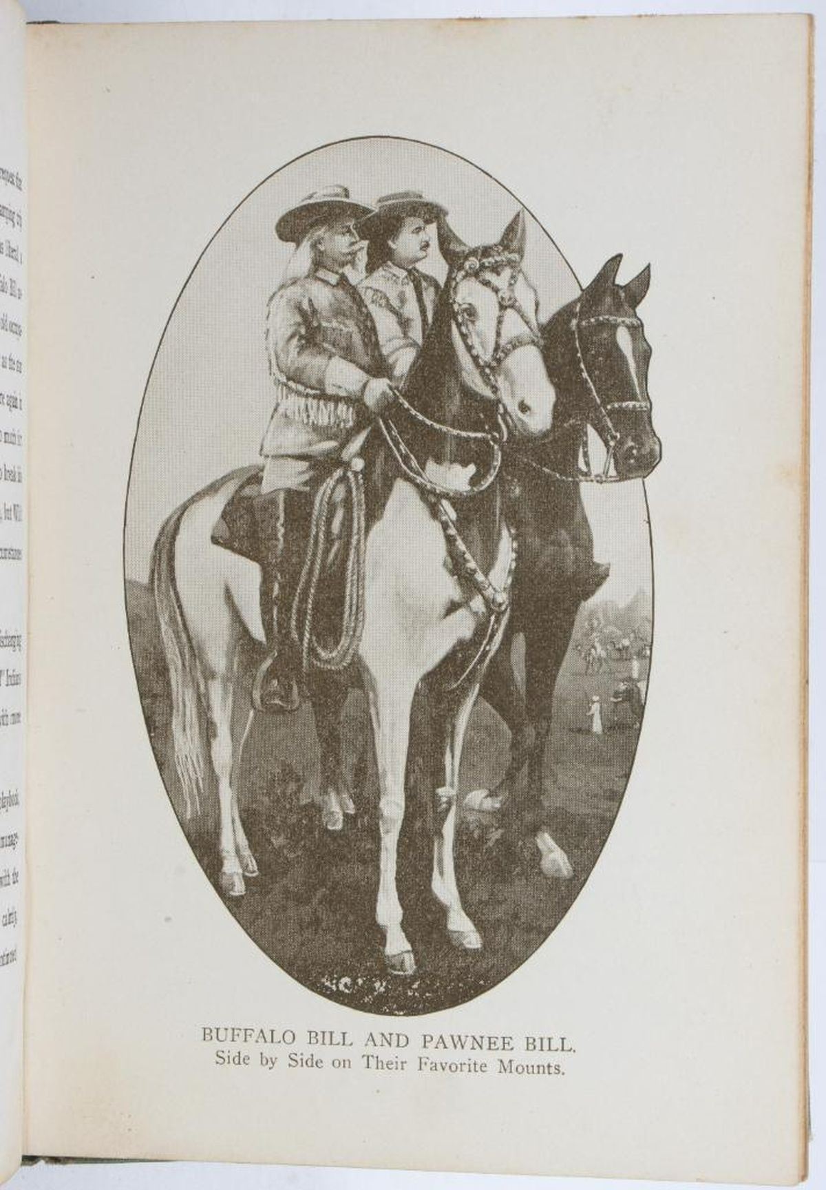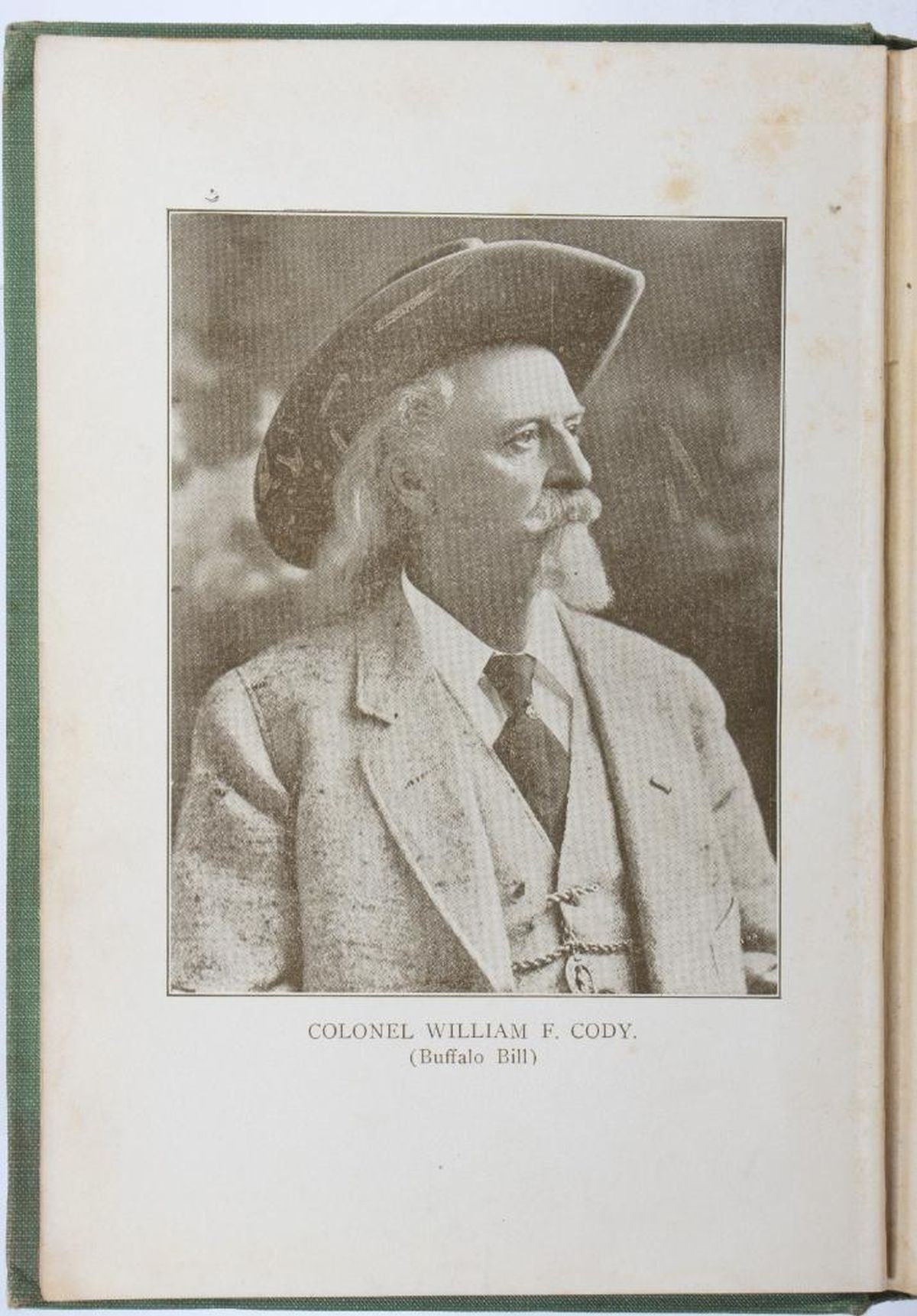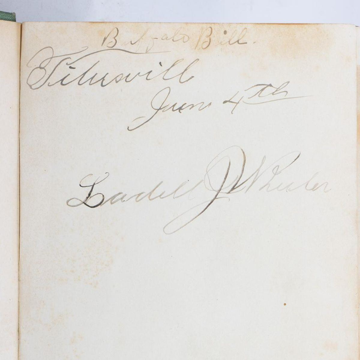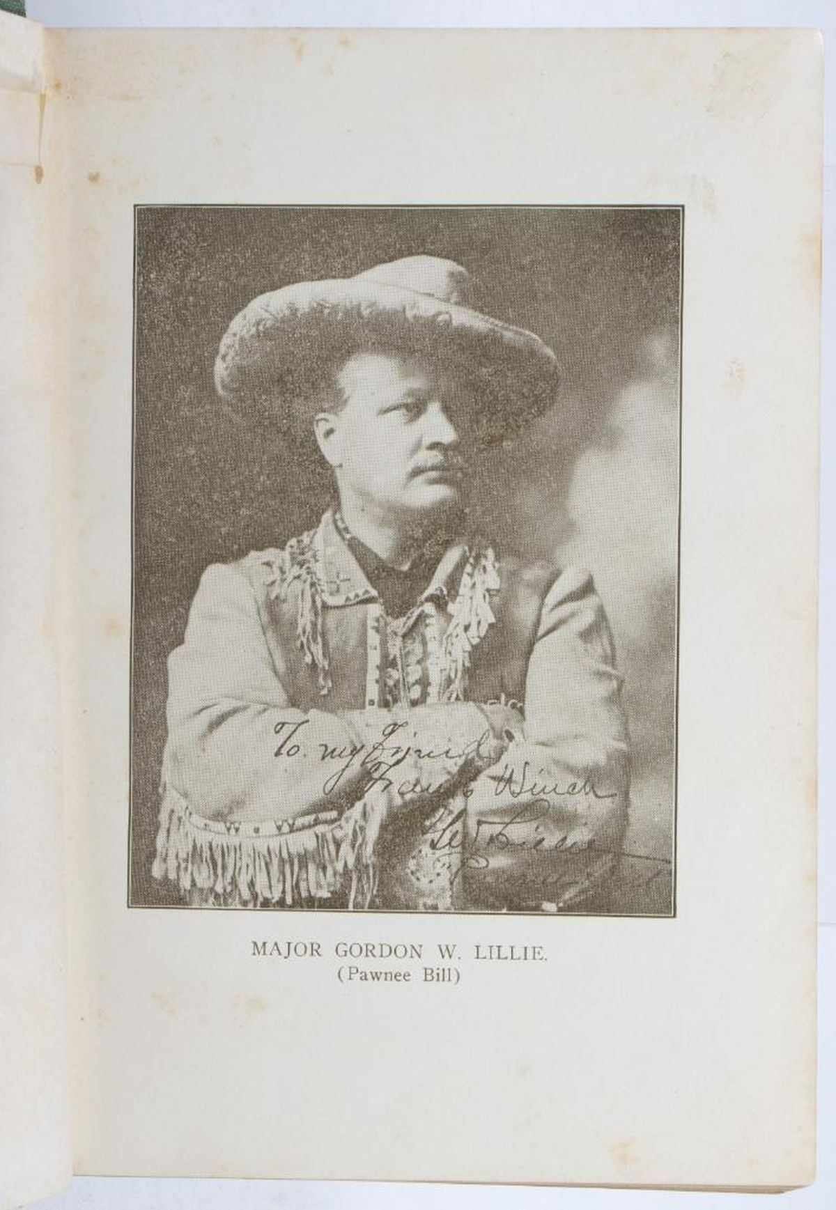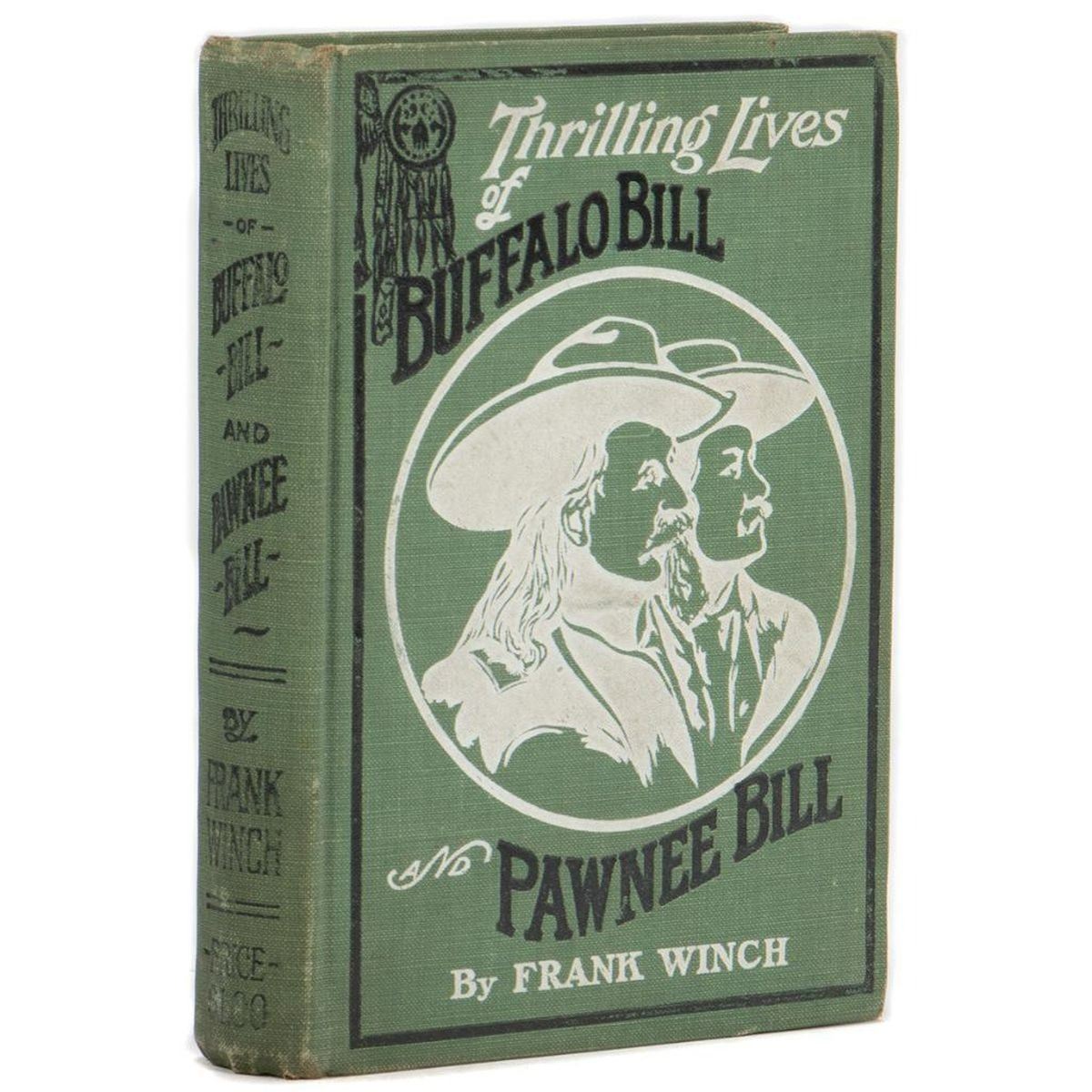 WINCH, FRANK. Thrilling Lives of Buffalo Bill, Colonel Wm. F. Cody Last of the Great Scouts, and Pawnee Bill, Major Gordon W. Lillie White Chief of the Pawnees. New York: S. L. Parsons & Co., Inc., 1911. Third edition. 12mo. Light green cloth with black and white pictorial cover. Good; wear to ends of spine, corners bumped, fading to spine, slight rubbing to cover but it's still bright, light foxing/soiling to endpapers and first two pages with portrait photos, spine moderately loosened. NOTE: The back of frontispiece has old inscriptions: "Buffalo Bill, Titusville, June 4th", with another name below. It appears to differ (?) from other examples of Cody's Buffalo Bill signature; however, please review image.