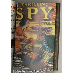 <B>Thrilling Spy Stories Pulp - Bound Volume (Standard, 1939-40).</B></I> The bound volume contains the Fall/39, Spring/40, Summer/40, and Winter/40 issues of <B>Thrilling Spy Stories</B></I> -- that's the complete four-issue run! Bound in black cloth, these pulps are getting a bit "soft" at the edges, but remain well protected by the hardcover binding (which has a solid spine, but there is some edge damage on the back board). The individual pulp covers are wonderfully clean, bright, and glossy. The Ultimate Guide to the Pulps VG value for group = $105. <BR><BR><B>Important notice:</B> Heritage usually auctions material at the rate of 200-250 lots per hour. On some occasions eBay Live bid software or the Internet may not be able to keep up with the pace of the auction. We recommend placing a realistic absentee bid now as insurance to avoid disappointment. Occasionally the auctioneer may eliminate or reject an eBay Live bid, and the auctioneer may also reopen a lot after the close of the eBay live bidding (usually because we missed an audience bid), and may reject your bid even if it shows you as the winning bidder. By bidding via eBay Live, you agree that Heritage may award the lot to another bidder at its sole discretion under the circumstances described above or any other reasonable circumstances. Since eBay bids are not shown to us until we open the lot on the floor, we treat those bids just like floor bids. In most cases the floor responds before the eBay bid is presented to us, due to Internet lag time, so for consistency we have made it a policy that floor bids are always considered first over tie eBay live bids. Also please note that all Heritage lots purchased through eBay Live carry a 20% Buyer's Premium. Please make sure you read the Terms and Conditions before you bid.