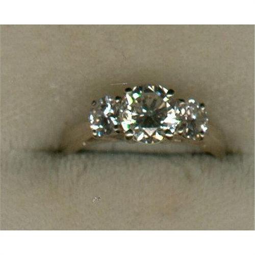 The largest diamond is a round brilliant cut weighing approximately1.00 carat J- I quality and raised slightly above two matching H-I SI quality diamonds weighing approximately .55 carats total This symbol of past, present and future sits above the 2.5mm wide tapered band.