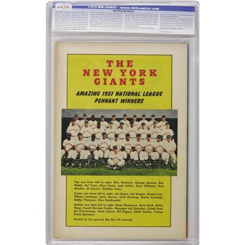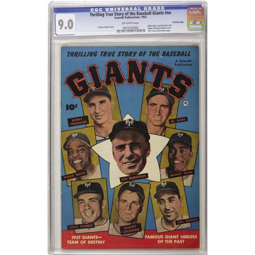 <B>Thrilling True Story of the Baseball Giants #nn Crowley Copy pedigree (Fawcett, 1952) CGC VF/NM 9.0 Off-white pages.</B></I> Willie Mays, Leo Durocher, and Bobby Thompson appear on the photo cover; The 1951 Giants team photo is the back cover. This issue has a Mays rookie photo-biography. Overstreet 2006 VF/NM 9.0 value = $683; NM- 9.2 value = $935. CGC census 10/06: 2 in 9.0, 2 higher.<BR><BR><b>Shipping:</b> Slabbed Comic (<a target="_blank" href="http://www.heritageauctions.com/common/shipping.php">view shipping information</a>)