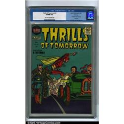 Thrills of Tomorrow #20 File copy (Harvey, 1955) CGC VF/NM 9.0 Light tan to off-white pages. This early Comics Code Authority-approved issue features a Simon and Kirby cover. If it strikes you that this looks like The King's work from the 1940s, that could be because the character has been reprised from that earlier time. Stories are reprinted from Stuntman Comics vintage nearly 10 years prior. This is the last issue of the title, but with your wise procurement of this high-grade book, Stuntman need never fade into oblivion. According to CGC's census, this is the best grade they have given this particular issue. Overstreet 2002 NM 9.4 value = $310. Important notice: We expect to be auctioning lots at the rate of 200-250 per hour. Sometimes eBay Premier live bid software cannot keep up with that pace, so we strongly recommend that you place a realistic proxy bid now as insurance to avoid disappointment. Also please note that all Heritage/CAA lots purchased through eBay Premier carry a 20% Buyer's Premium.