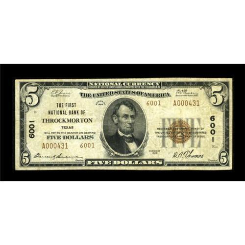 <B>Throckmorton, TX</B></I> - $5 1929 Ty. 2 <B>The First NB</B></I> Ch. # 6001<BR> The census reports a total of only a dozen small notes, but only one other Type 2. In fact, this is the only Type 2 $5 to surface on this one bank town. <B>Fine.</B></I><BR><BR><b>Shipping:</b> Coins & Currency (<a target="_blank" href="http://www.heritageauctions.com/common/shipping.php">view shipping information</a>)