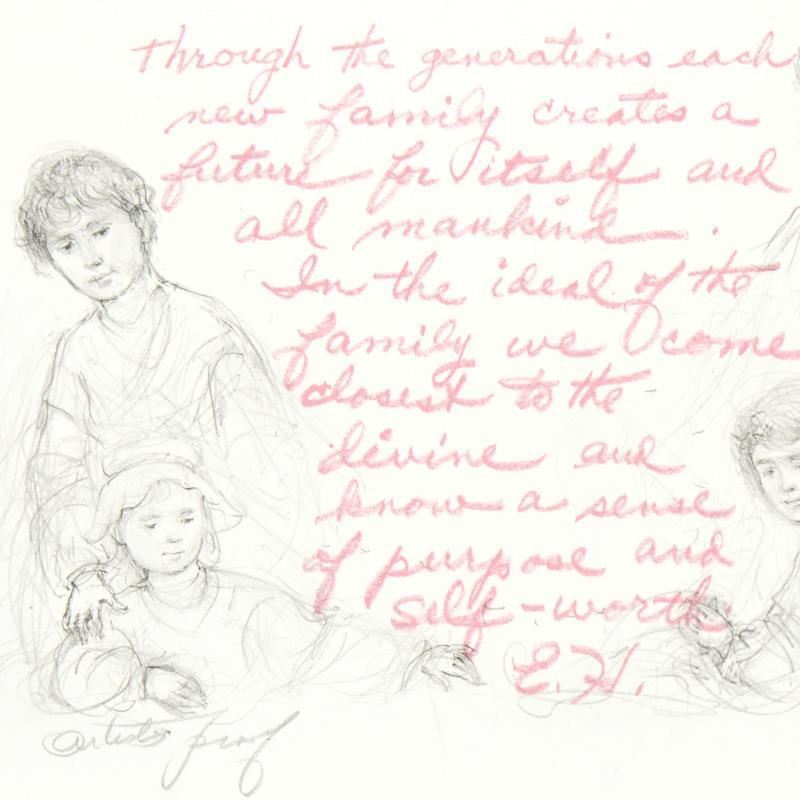 "Through the Generations" is a limited edition lithograph on paper by Edna Hibel (1917-2014), Numbered and Hand Signed by the artist. Includes Certificate of Authenticity. Measures approx. 16" x 12.5" (border), 12" x 9" (image).