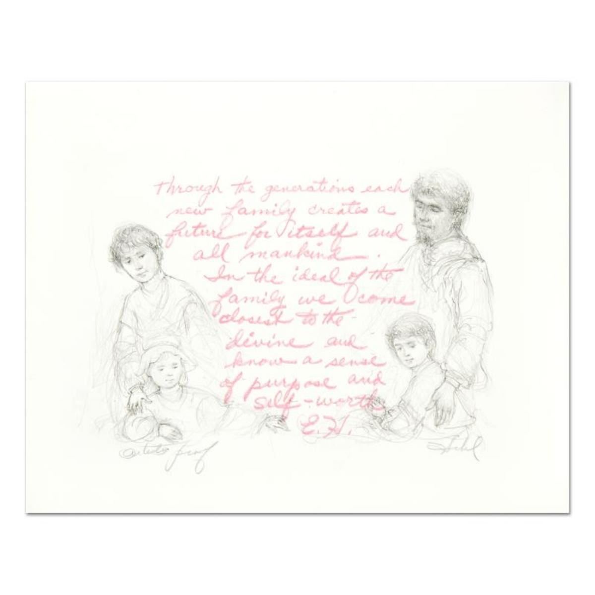 "Through the Generations" is a limited edition lithograph on paper by Edna Hibel (1917-2014), Numbered and Hand Signed by the artist. Includes Certificate of Authenticity. Measures approx. 16" x 12.5" (border), 12" x 9" (image).