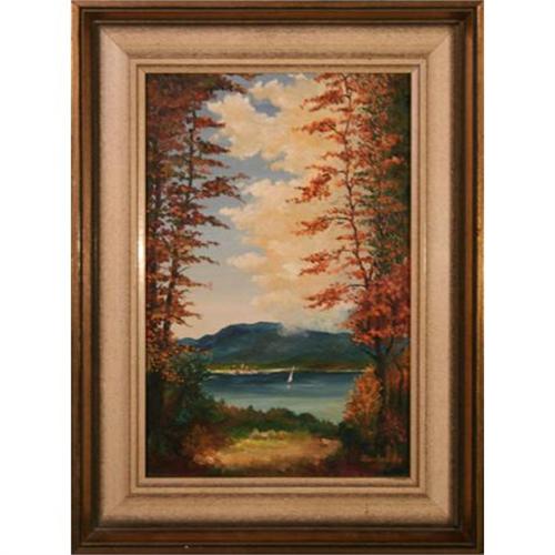 ?Through the Trees? is a gorgeous landscape oil painting by talented artist Roschinsky. A sailboat glides across deep blue sapphire water which seems to reflect the cool blue, mountains in the distance. The vertical composition is flanked on either side by tall trees with their changing leaves of burnt orange and gold rustling in the breeze. Roschinsky?s impressionist style using quick brushstrokes, gives the piece energy and warmth. The painting has been mounted in a beautifully beveled two-tone frame of antiqued almond and gold that perfectly compliments the rich autumnal colors within the composition. Including the lovely frame, ?Through the Trees,? measures 11 3/8? x 15 1/8.? This Roschinsky piece is an absolute gem that would be a stunning and affordable addition to any collection of seasonal landscape paintings.