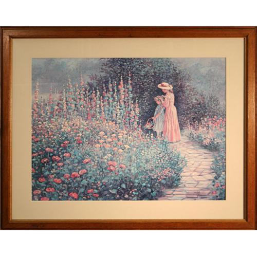 This delightful print, entitled ?Thru God?s Grace,? of the talented Bettie Zelder?s work, depicts a beautiful floral garden with two young ladies walking through its confines, perhaps a mother and daughter. The younger of the two is carrying a basket of freshly cut flowers, while the other is delicately weaving them into a crown for the little girl to wear. They are dressed in the height of fashion of a bye gone era, when lace trimmed elegant gowns and fancy hats were all the rage. A cobblestone path winds through the garden, inviting the viewer to amble along it to enjoy the abundance of nature blooming on either side of it. The day is sunny and serene as the two young ladies enjoy their surroundings and each other?s company. The colors are subtle, thus creating a more vintage atmosphere around the piece. The use of atmospheric perspective is likewise just as wonderful, gently receding into the background, leaving one to wonder about where the garden path leads. These and other details have not gone unnoticed by the artist, who has charmingly captured them in the form of flowers and leaves. This lovely print has been matted with a soft dove grey that superbly picks up the same tones in the work. The frame, comprised of a gorgeously dark oak wood, with a golden inner liner, is a classic choice that has a marvelous traditional feeling. Including the frame, this very attractive work of art measures 30 ¼? x 24 ¼? and includes the signature and title in the lower right hand corner. ...