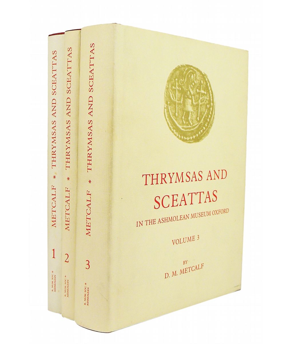 Metcalf, D.M. THRYMSAS AND SCEATTAS IN THE ASHMOLEAN MUSEUM OXFORD. VOLUMES 1-3. London, 1993-94. Three volumes, complete. 8vo, original matching red cloth, gilt; jackets. xvi, 165, (3); vii, (1), 169-293, (1); viii, 297-685, (3) pages; text figures; 28 plates of coins with facing text. Fine. A complete set of these important works. Royal Numismatic Society, Special Publication No. 27.