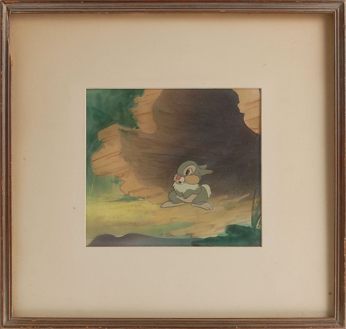 (Walt Disney Studios, 1942) Superb original production cel from Bambi, showing a full-length pose of Thumper hiding inside a hollow log. The cel has been trimmed and applied to a hand-painted background as prepared by Courvoisier Galleries for sale. Image measures 2.25 x 2, with a mat opening of 7.25 x 6.5. This piece is also framed to an overall size of 14 x 13.5. The piece has the original Disney Courvoisier Galleries label on the reverse. In fine condition.