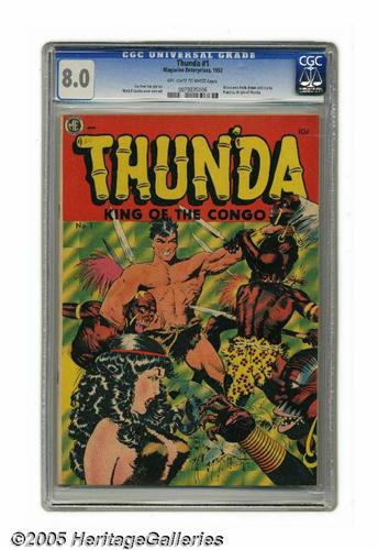 <B>Thun'da #1 (Magazine Enterprises, 1952) CGC VF 8.0 Off-white to white pages.</B></I> How many comic books would you guess were drawn in their entirety (cover and interior) by Frank Frazetta? If you guessed one, you're correct, and this is it right here. Thun'da's origin story is recounted here. Considering the highest grade CGC has assigned the book to date is a 9.0, our offering is one of the better ones out there. Overstreet 2005 VF 8.0 value = $913. CGC census 3/05: 6 in 8.0, 6 higher.