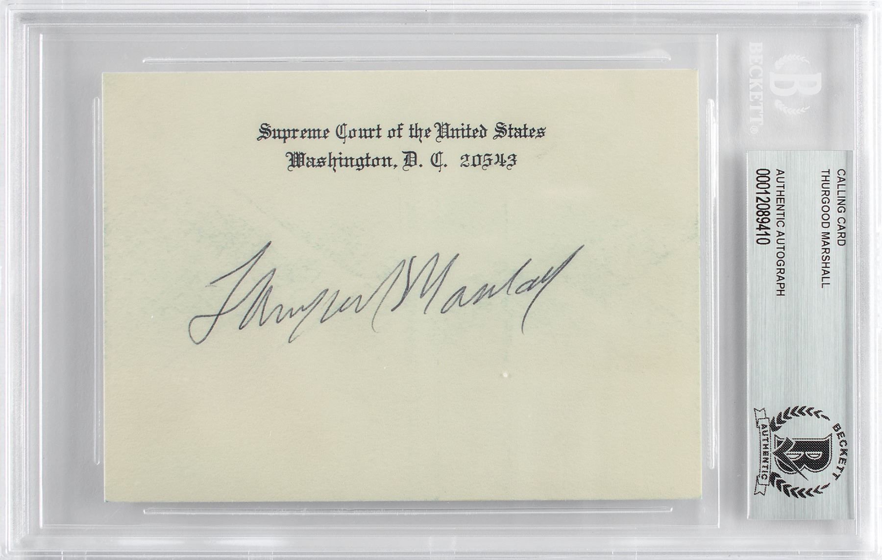 Ballpoint signature, "Thurgood Marshall,” on an off-white 4.75 x 3.5 Supreme Court of the United States card. In fine condition. Encapsulated in a Beckett authentication holder.
