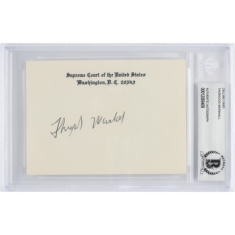 Ballpoint signature, "Thurgood Marshall,” on an off-white 4.75 x 3.5 Supreme Court of the United States card. In very fine condition. Encapsulated in a Beckett authentication holder.