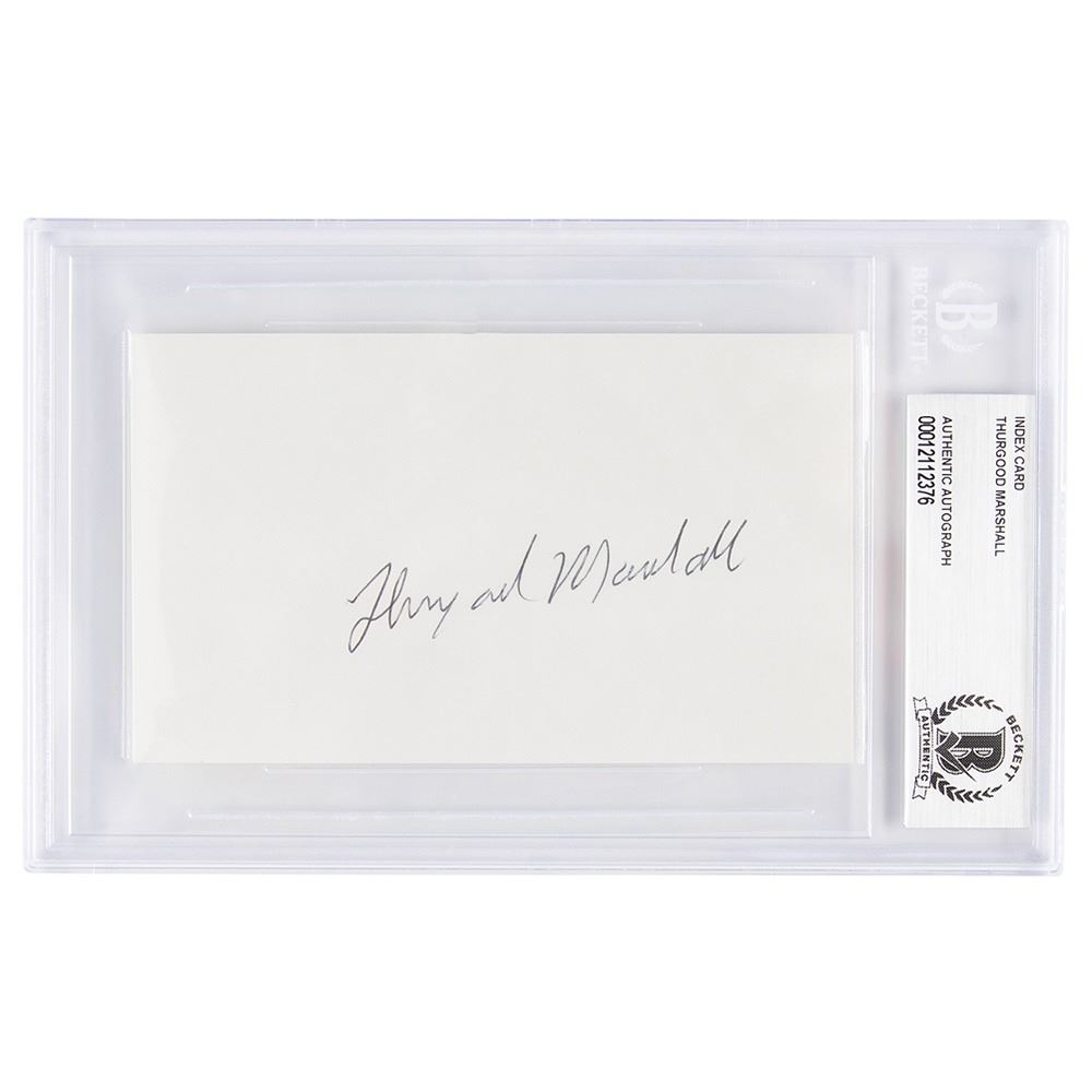 Ballpoint signature, "Thurgood Marshall,” on an off-white 5 x 3 card. In very fine condition. Encapsulated in a Beckett authentication holder.