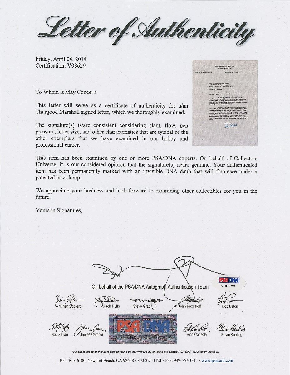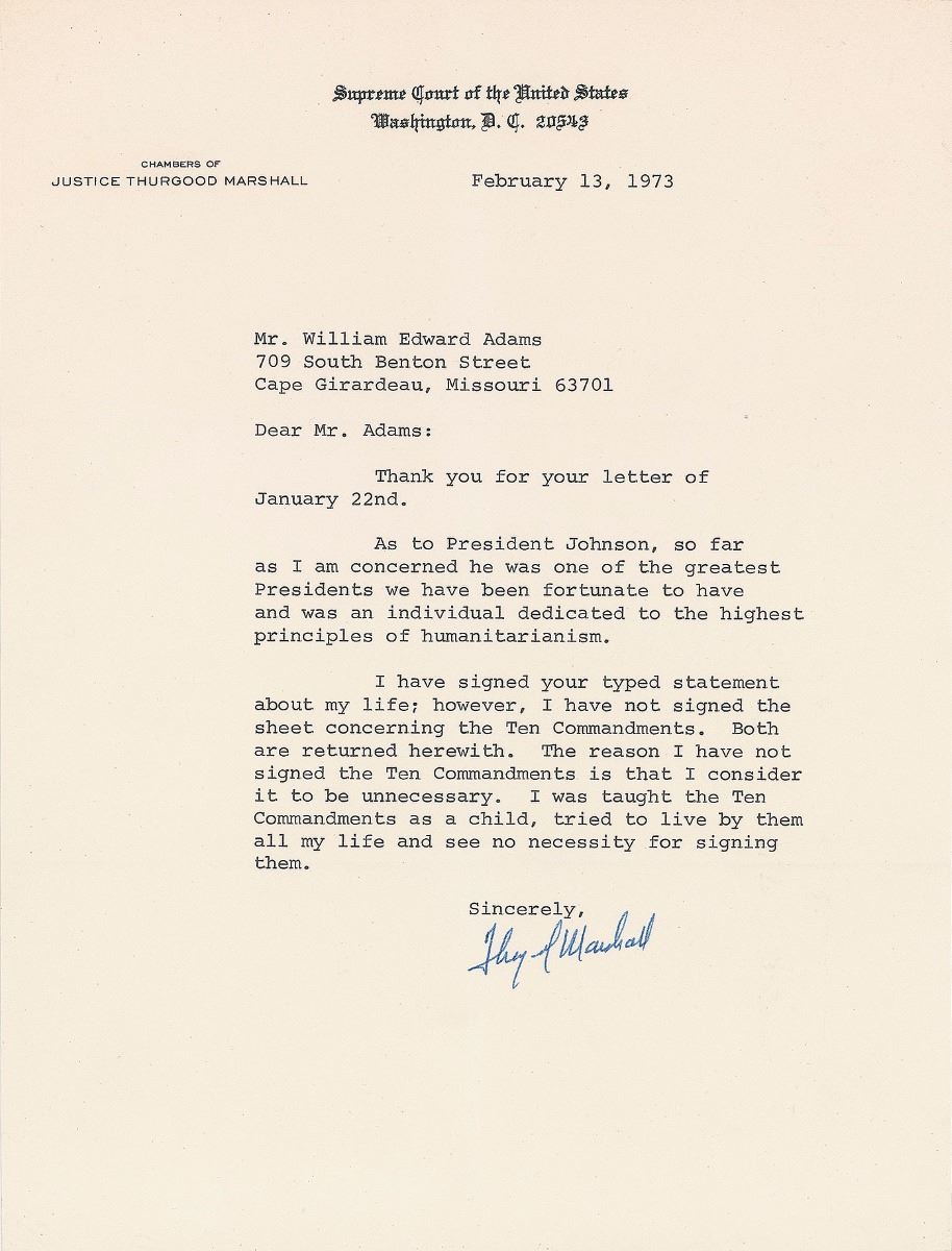 TLS, one page, 8 x 10.5, Supreme Court of the United States letterhead, February 13, 1973. Letter to an admirer. In part: “As to President Johnson, so far as I am concerned he was one of the greatest Presidents we have been fortunate to have and was an individual dedicated to the highest principles of humanitarianism…I have not signed the sheet concerning the Ten Commandments…The reason I have not signed the Ten Commandments is that I consider it to be unnecessary. I was taught the Ten Commandments as a child, tried to live by them all my life and see no necessity for signing them.” In fine condition. Accompanied by a full letter of authenticity from PSA/DNA.