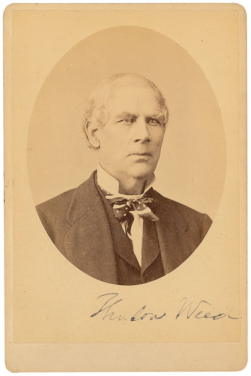 New York newspaper publisher (1797–1882) and ardent Lincoln supporter, who played an instrumental role in securing the presidential nominations of Harrison, Clay, Taylor, Scott, Fremont, and Lincoln, between 1840 and 1860. Original 4.25 x 6.5 cabinet phot