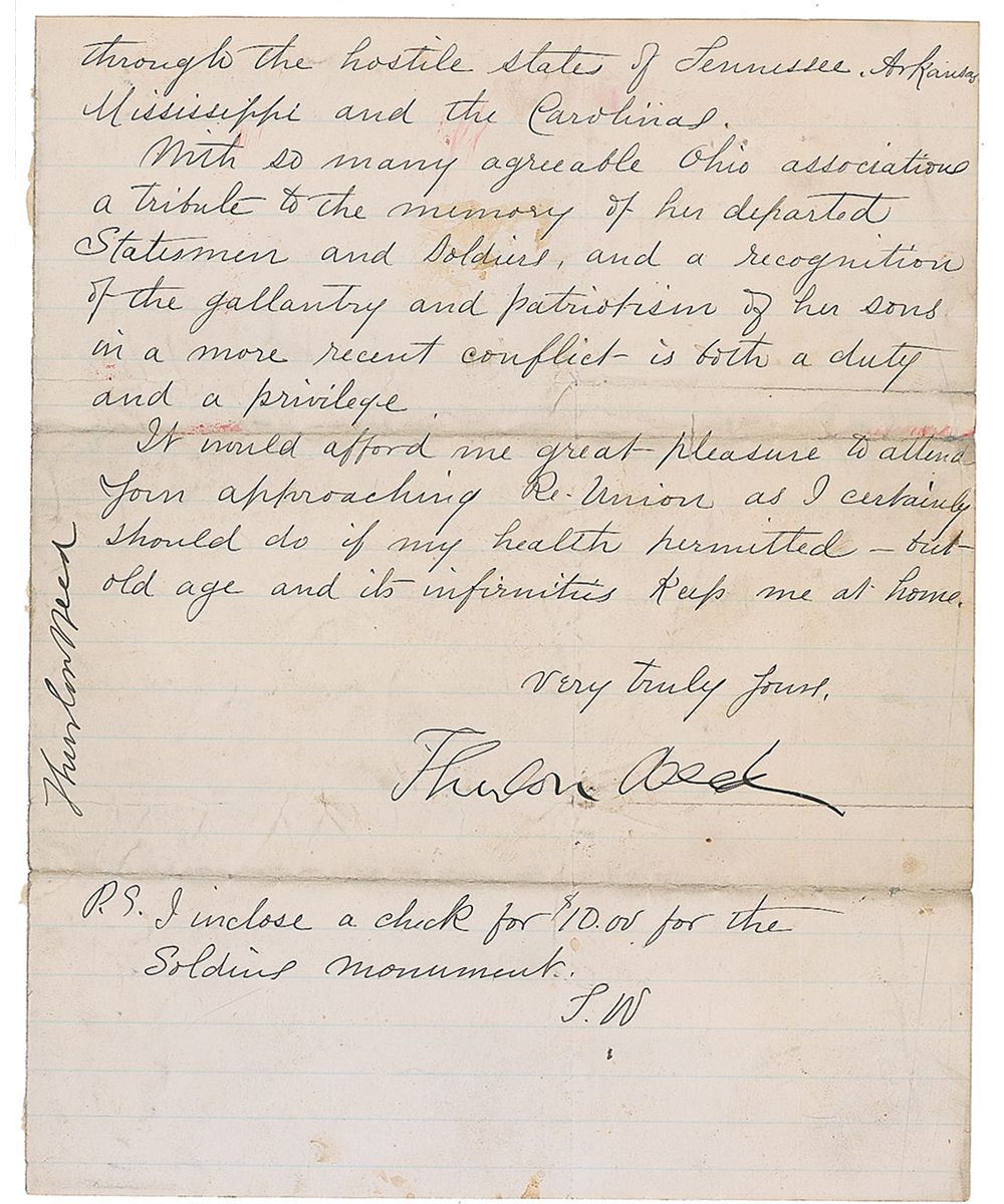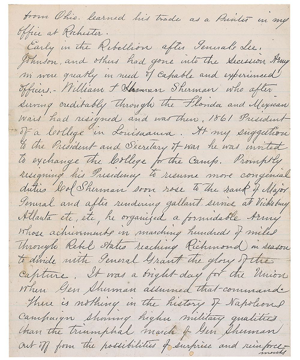 New York newspaper publisher (1797–1882) and ardent Lincoln supporter, who played an instrumental role in securing the presidential nominations of Harrison, Clay, Taylor, Scott, Fremont, and Lincoln, between 1840 and 1860. LS, three pages, lightly-lined on two sheets, 7.75 x 9.5, August 1, 1881. Letter to a gentleman, regarding Ohio. In part: “Ohio succeeds Virginia as the Mother of Presidents. It has been my privilege…to have known and been honored with the friendship of Presidents Harrison, Hayes, and Garfield—whose life, as the world grieves to know is suspended by a thread…Early in the Rebellion after Generals Lee, Johnson, and others had gone into the secession Army we were greatly in need of capable and experienced officers…Col. Sherman soon rose to the rank of Major General and after rendering gallant service at Vicksburg, Atlanta, etc…he organized a formidable Army whose achievements in marching hundreds of miles through Rebel States reaching Richmond in season to divide with General Grant the glory of the capture. It was a bright day for the Union when Gen. Sherman assumed that command. There is nothing in the history of Napoleon’s campaign showing higher military qualities than the triumphal march of Gen. Sherman.” In very good condition, with intersecting folds (two vertical folds passing through single letters of the signature), scattered soiling, and mounting remnants to left border.