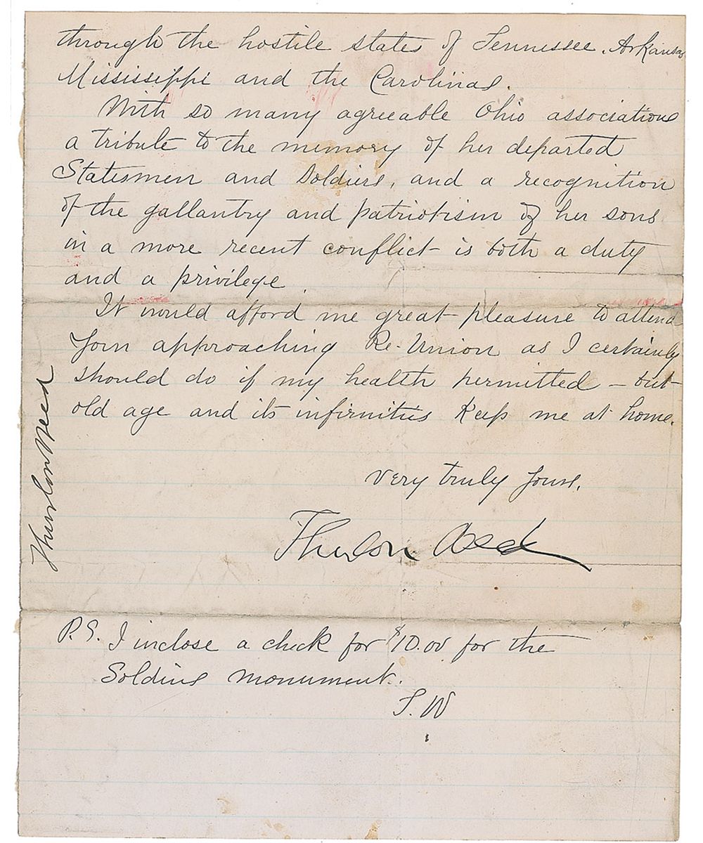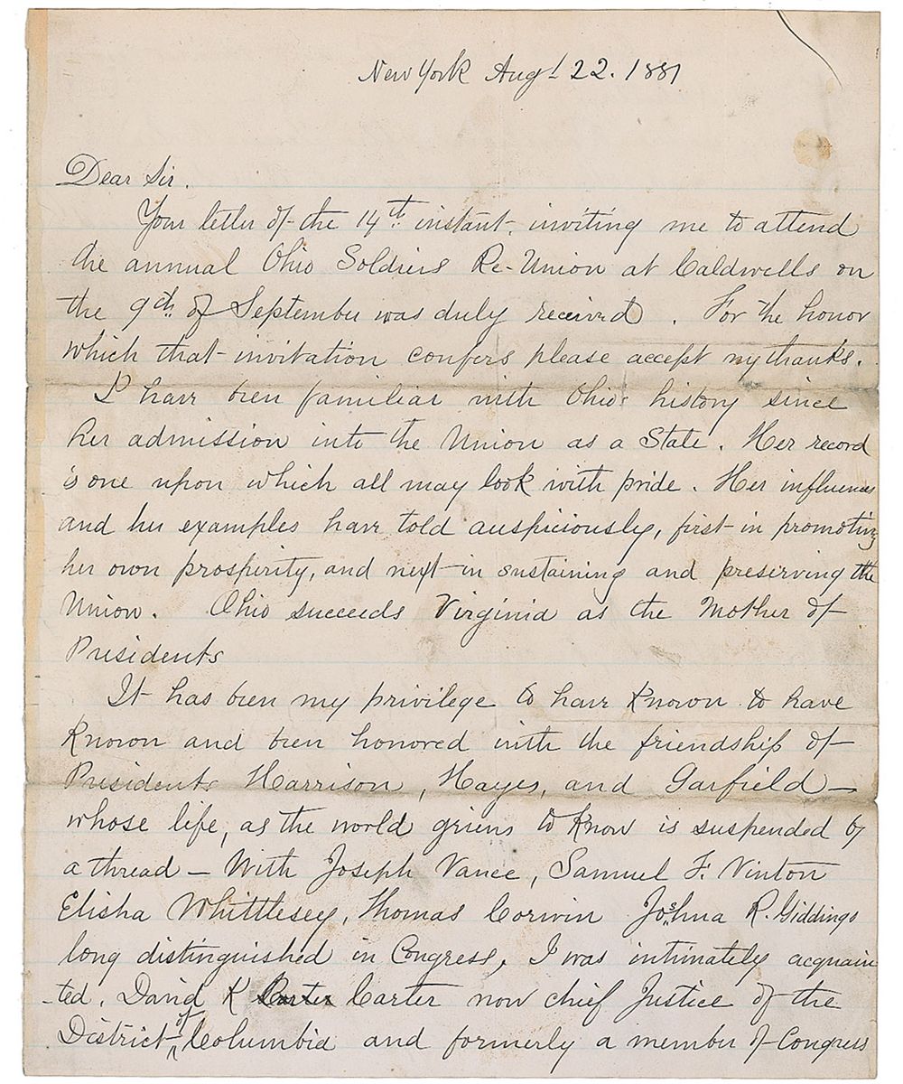New York newspaper publisher (1797–1882) and ardent Lincoln supporter, who played an instrumental role in securing the presidential nominations of Harrison, Clay, Taylor, Scott, Fremont, and Lincoln, between 1840 and 1860. LS, three pages, lightly-lined on two sheets, 7.75 x 9.5, August 1, 1881. Letter to a gentleman, regarding Ohio. In part: “Ohio succeeds Virginia as the Mother of Presidents. It has been my privilege…to have known and been honored with the friendship of Presidents Harrison, Hayes, and Garfield—whose life, as the world grieves to know is suspended by a thread…Early in the Rebellion after Generals Lee, Johnson, and others had gone into the secession Army we were greatly in need of capable and experienced officers…Col. Sherman soon rose to the rank of Major General and after rendering gallant service at Vicksburg, Atlanta, etc…he organized a formidable Army whose achievements in marching hundreds of miles through Rebel States reaching Richmond in season to divide with General Grant the glory of the capture. It was a bright day for the Union when Gen. Sherman assumed that command. There is nothing in the history of Napoleon’s campaign showing higher military qualities than the triumphal march of Gen. Sherman.” In very good condition, with intersecting folds (two vertical folds passing through single letters of the signature), scattered soiling, and mounting remnants to left border.
