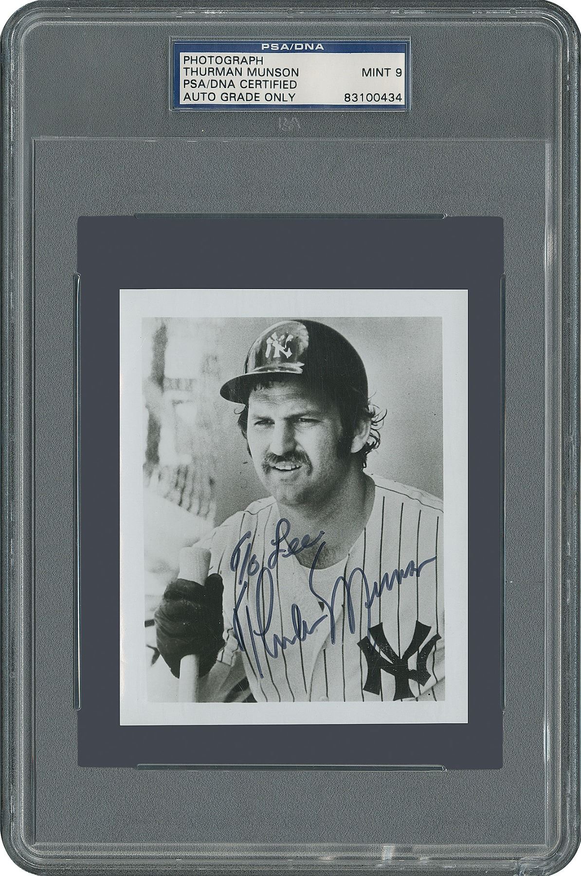 Glossy 4 x 5 photo of Munson in the dugout wearing his Yankees uniform, signed and inscribed in black felt tip, "To Lee, Thurman Munson." In fine condition, with a few light creases. Encapsulated in a PSA/DNA authentication and grading holder, evaluating the autograph as "Mint 9."