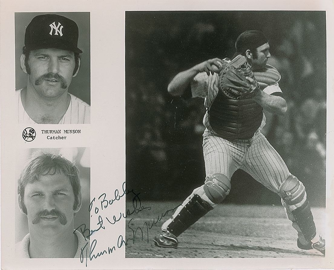 Rare and sought-after glossy 10 x 8 photo featuring three images of the Yankees catcher, signed and inscribed in black felt tip, "To Bobby, Best wishes, Thurman Munson.” In fine condition, with a short tear to the right edge. Accompanied by a full letter of authenticity from PSA/DNA. Munson remains quite rare in signed photos of this size.
