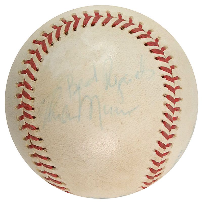 Heart and soul of the 1970s New York Yankees. On August 2, 1979, Munson was practicing touch-and-go landings at the Akron-Canton Airport with his newly purchased Cessna Citation. The twin-engine jet fell 1000 feet short of the runway during an attempted landing and burst into flames. Munson was killed in the accident while two others were injured. Official Spalding American League baseball signed in blue ballpoint on a side panel, “Best Regards, Thurman Munson.” In very good condition, with signature uniformly light, but still completely legible, a mild shade of toning to ball, and a bit of light soiling. Accompanied by a letter of authenticity from James Spence.