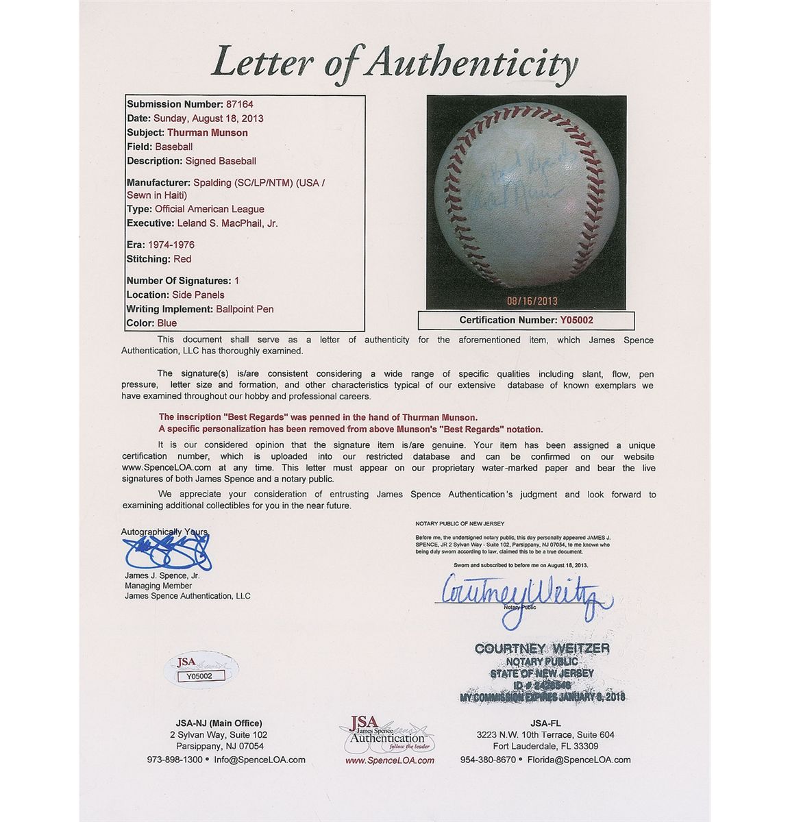 Heart and soul of the 1970s New York Yankees eho was killed in a plane crash in 1979. Official Spalding American League baseball signed in blue ballpoint on a side panel, “Best Regards, Thurman Munson.” In very good condition, with removal of an inscription above the signature, the signature uniformly light but still completely legible, a mild shade of toning to ball, and a bit of light soiling. Accompanied by a letter of authenticity from James Spence.