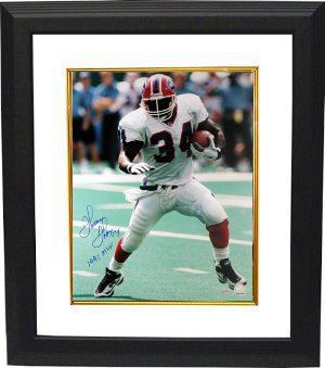 Thurman Thomas was the AFC rushing leader in 1990, 1991, and 1993. He was voted to the All-Pro team in 1990 and 1991, was selected to 5 straight Pro Bowls from 1989–1993, and was named NFL's Most Valuable Player in 1991. Thomas currently holds the all-time Buffalo Bills rushing record with 11,938 yards and the team record for yards from scrimmage with 16,279 over 12 years. Thurman Thomas has hand autographed this Buffalo Bills 16x20 Color Photo with 1991 MVP Inscription. Custom White Mat and Black Frame as shown. GTSM hologram and Certificate of Authenticity from Athlon Sports.