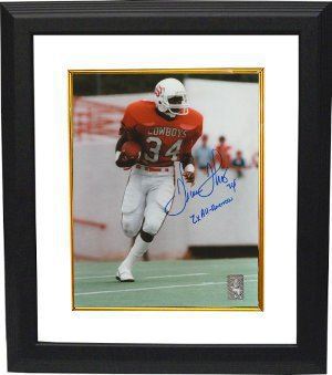 At Oklahoma State, Thurman Thomas had 897 rushes for 4,595 yards, 43 touchdowns, and 21 100-yard rushing games. He was also a Heisman Trophy candidate in his senior year. He was a first team selection on the College Football All-America Team in 1985 and 1987. In the 1987 Sun Bowl, Thomas ran for 157 yards and four touchdowns in the 35-33 victory over West Virginia, keeping Barry Sanders on the sidelines for the majority of the game. Thomas left OSU as the school's all-time leading rusher and his number 34 is one of only three jerseys retired at Oklahoma State. Sanders would replace Thomas as starter the next year in 1988. Thurman Thomas has hand autographed this Oklahoma State Cowboys 8x10 Color Photo with 2 X All American inscription . GTSM hologram and Certificate of Authenticity from Athlon Sports. Custom White Mat and Premium Black Framed as shown.