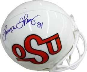 At Oklahoma State, Thurman Thomas had 897 rushes for 4,595 yards, 43 touchdowns, and 21 100-yard rushing games. He was also a Heisman Trophy candidate in his senior year. He was a first team selection on the College Football All-America Team in 1985 and 1987. In the 1987 Sun Bowl, Thomas ran for 157 yards and four touchdowns in the 35-33 victory over West Virginia, keeping Barry Sanders on the sidelines for the majority of the game. Thomas left OSU as the school's all-time leading rusher and his number 34 is one of only three jerseys retired at Oklahoma State. Sanders would replace Thomas as starter the next year in 1988. Thurman Thomas has hand autographed this Oklahoma State Cowboys Authentic Helmet. GTSM Hologram and Certificate of Authenticity from Athlon Sports.