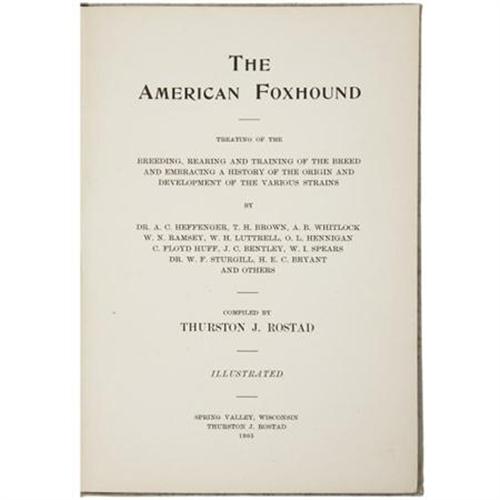 <B>Thurston J. Rostad, compiler. </B></I><B><I>The American Foxhound</B></I></B></I><B>. </B></I>Spring Valley: Thurston J. Rostad, 1905. <BR> <BR>First edition. Twelvemo. 63 pages. Illustrated.<BR><BR>Original pictorial grey cloth. Corners bumped. Boards soiled. Contents sound. Very good.<BR><BR><BR><b>Shipping:</b> Books & Catalogs (<a target="_blank" href="http://www.heritageauctions.com/common/shipping.php">view shipping information</a>