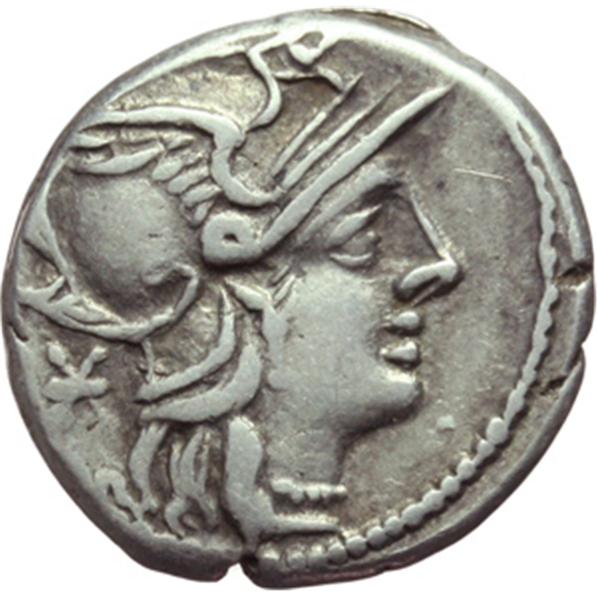 Repubblica Romana. Ti Minucius C. f. Augurinus. Denario, 134 a.C. D/ Testa di Roma a destra. Dietro, X. R/ TI. MINVCI C.F. AVGVRINI. Colonna costituita da macine di mulino; sulla cima, statua virile togata con scettro. Ai lati della base, due spighe di grano. Ai lati della colonna, due cittadini togati; quello di sinistra ha un piede su un modio e offre un pane, quello di destra tiene un lituus. In alto, RO-MA. Cr. 243/1. B.9. AG. g. 3.86 mm. 18.00 Bel BB+/BB.