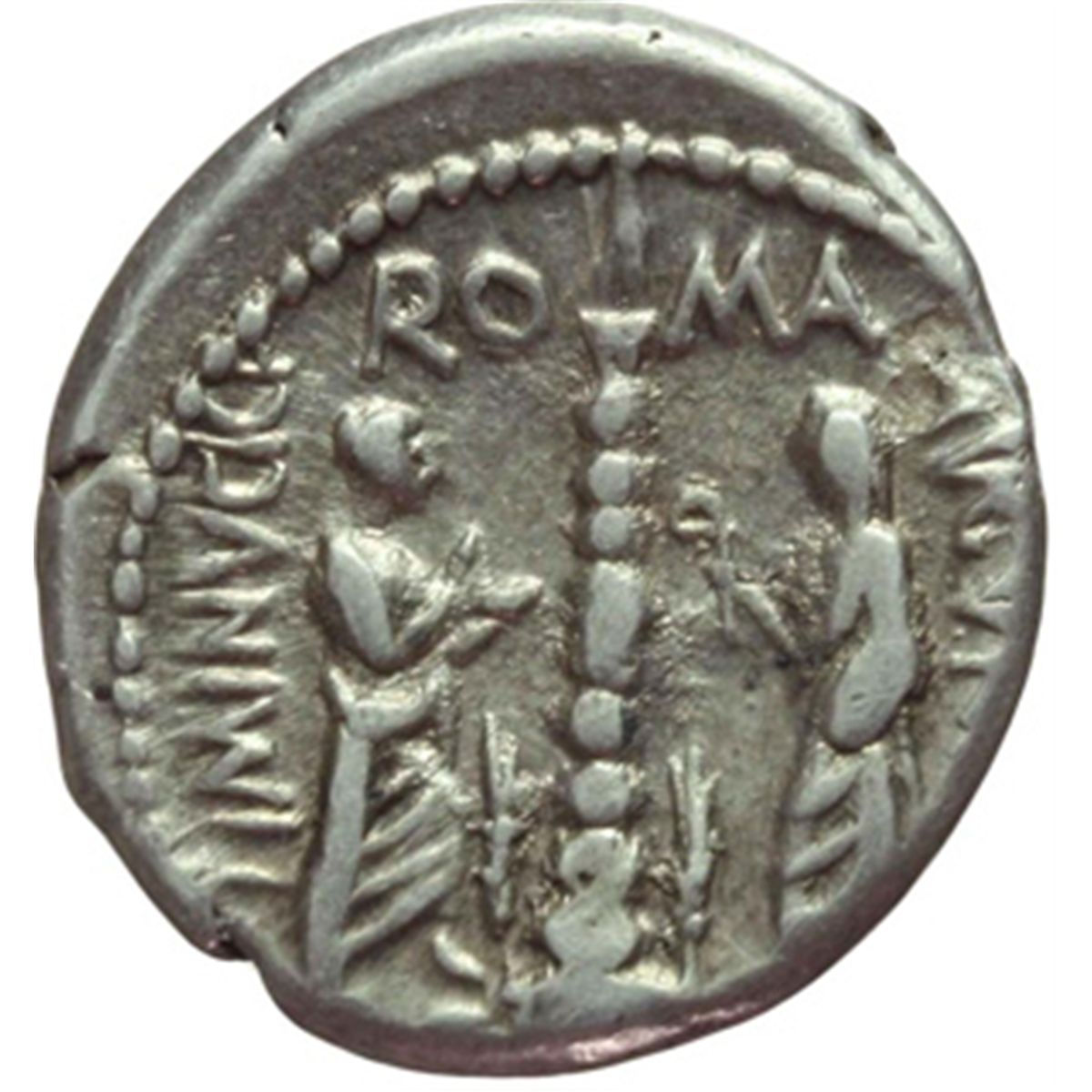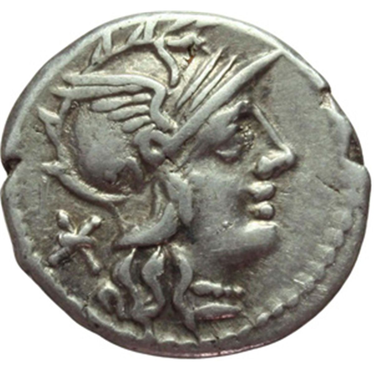 Repubblica Romana. Ti. Minucius C. f. Augurinus. Denario, 134 a.C. D/ Testa di Roma a destra. Dietro, X. R/ Colonna ionica sormontata da statua tra due cittadini togati. Sopra, RO-MA. A sinistra, TI. MINVCI. C.F. A destra, AVGVRINI. Cr. 243/1. B.9. AG. g. 3.82 mm. 18.50 Fondi lucenti. Bel BB+.